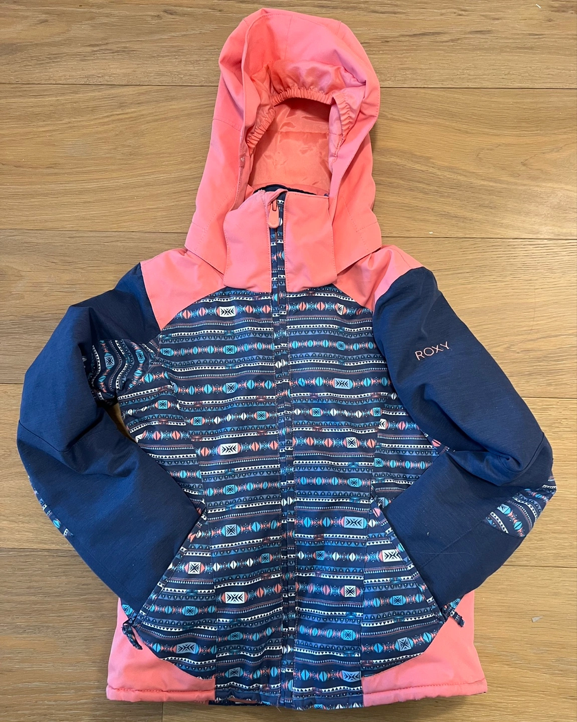 Roxy. Pink and navy blue snow jacket. Features a patterned body and solid coloured sleeves and hood. Includes interior pockets. Waterproof and breathable. Asking $25 Smoke free pet free home Located in south Whitby by the marina