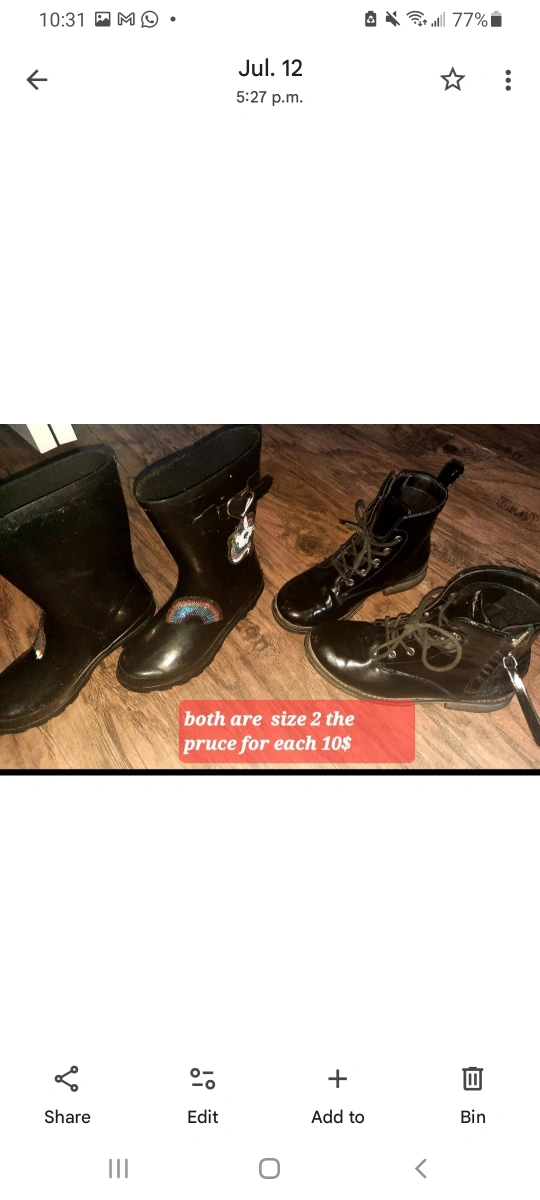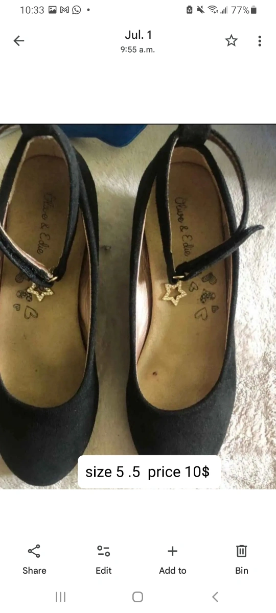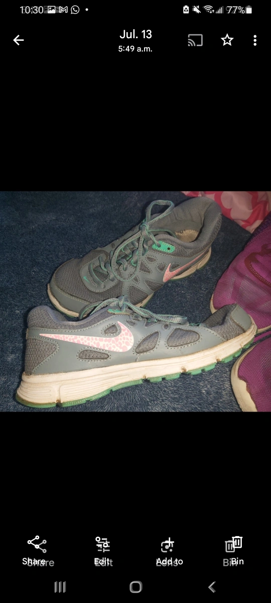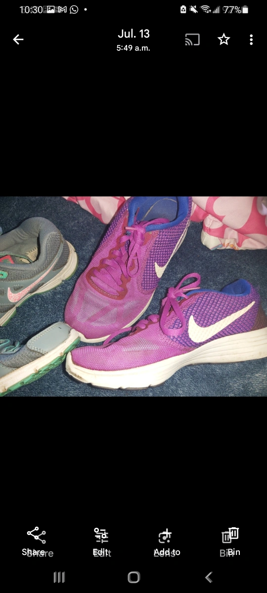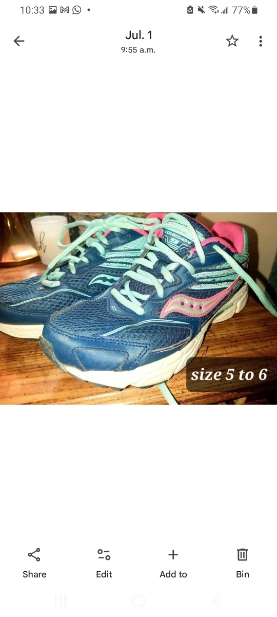 A collection of girls' shoes in various sizes and styles. There are Saucony running shoes (size 5-6), black flats (size 5.5), pink shoes, Reebok sneakers (size 6), and sandals (size 5).