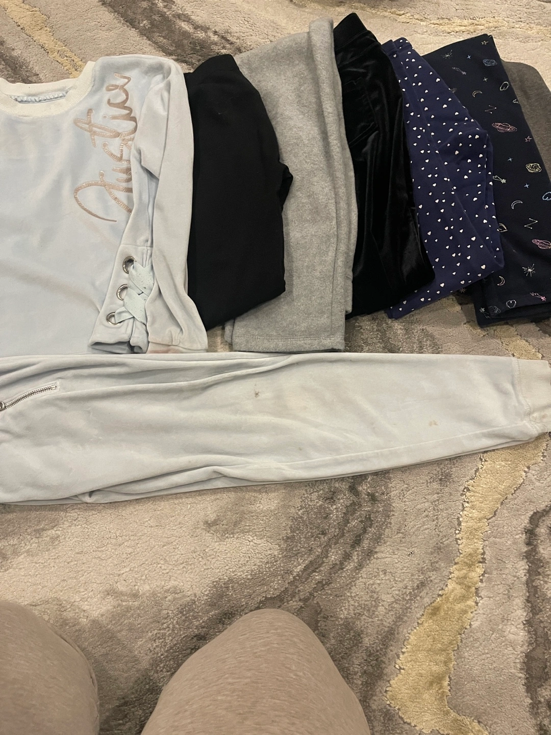 All in good condition ! Blue jogging set , pants have some splash dirt martks and a stain on the wrist if the sleeve . With some scrubbing could come out . Shown in second photo All pants are cozy or fleece inside GAP, children’s place , justice Thickson and Dundas Whitby