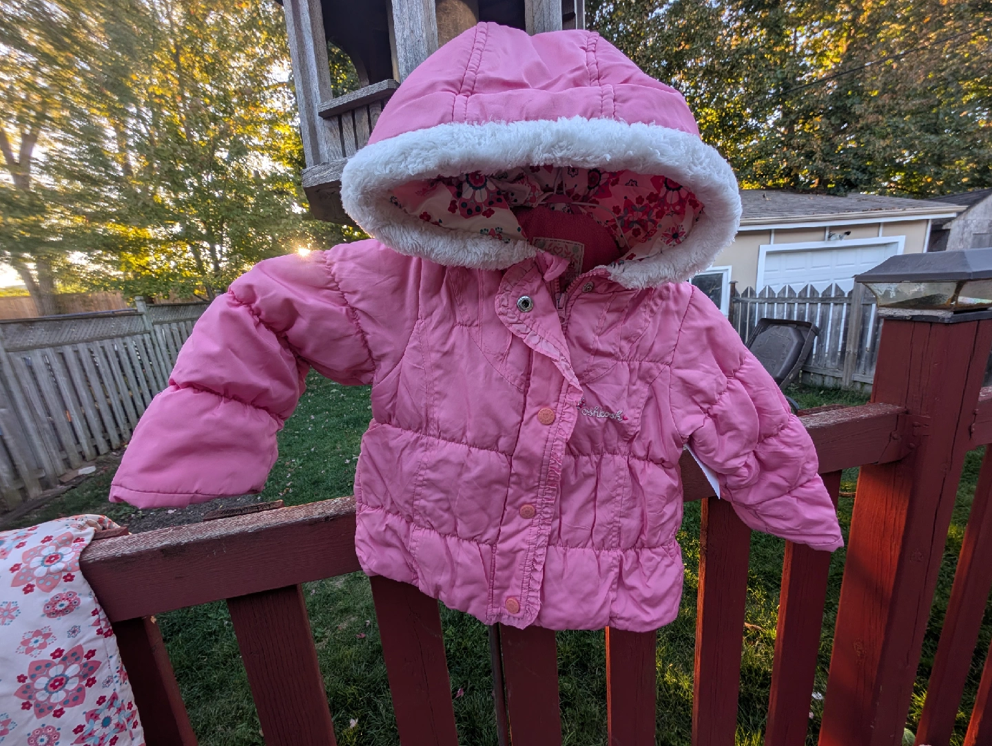 Girls size 24 months, 2 piece, Osh Kosh snowsuit. Coat has fur trim on hood, hood is not removable. Pants have adjustable straps that have clip closures for easier removal if needed. Some minor dirt staining on coat cuffs.