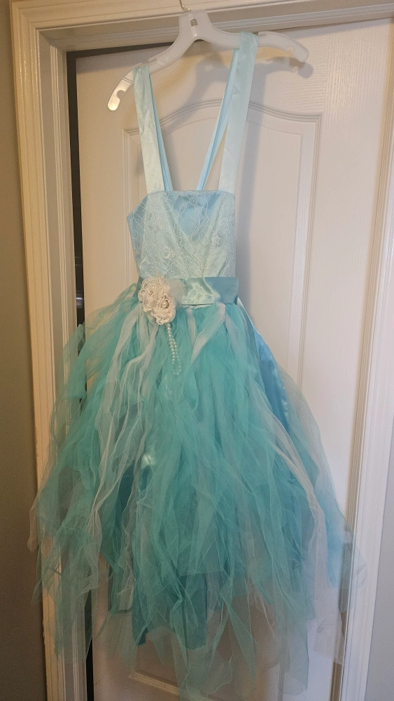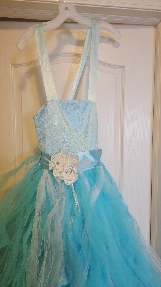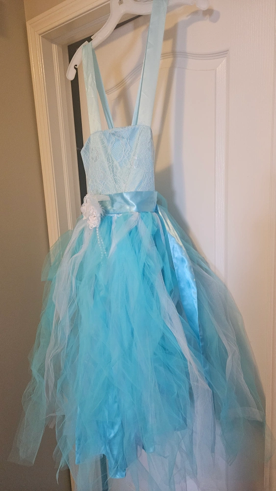 Beautiful light blue tulle dress. Lace bodice and satin ribbon accent. Perfect for flower girl or special occasion. Size is 10.