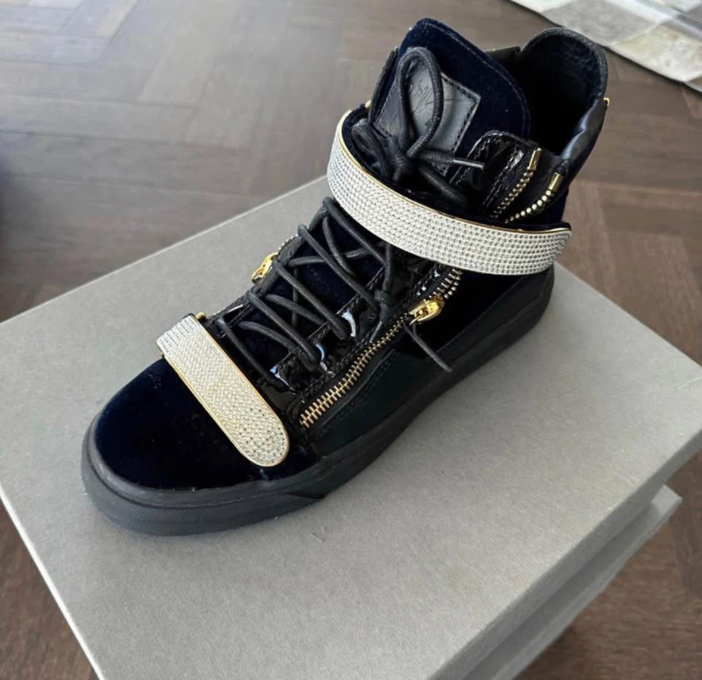 Selling a pair of Giuseppe Zanotti high-top sneakers in black. These stylish sneakers feature a unique design with zippers and a decorative strap. They are in great condition and perfect for adding a touch of luxury to your everyday look!