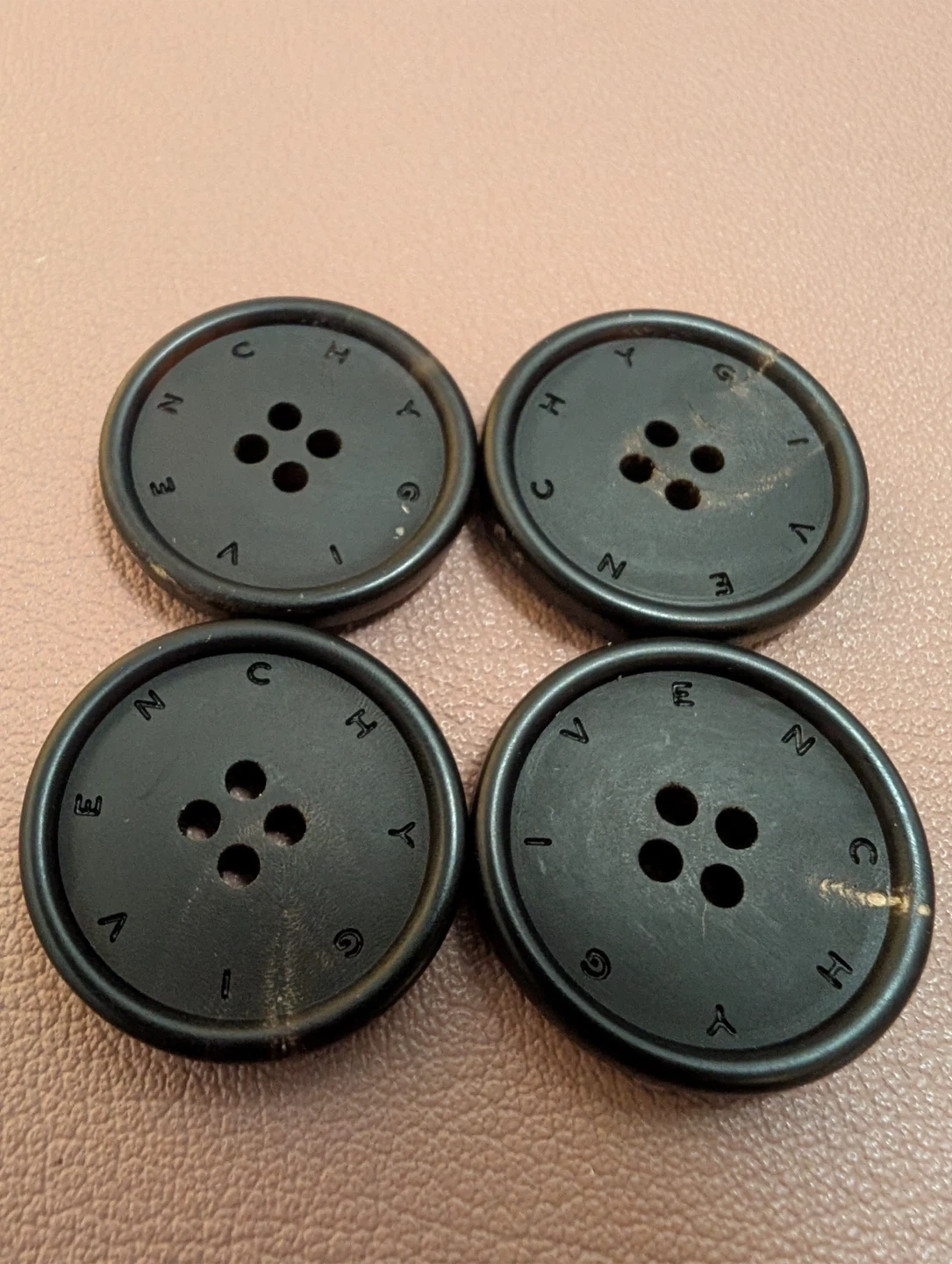 Selling a set of four Givenchy black buttons. They have a unique design with Givenchy logo around the edge. Perfect for adding a touch of retro style to your sewing projects or crafts!