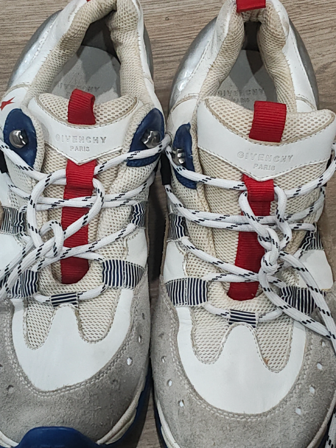 Selling a pair of Givenchy Paris sneakers. They are white, red, and blue. They have some wear, but are still in good condition!