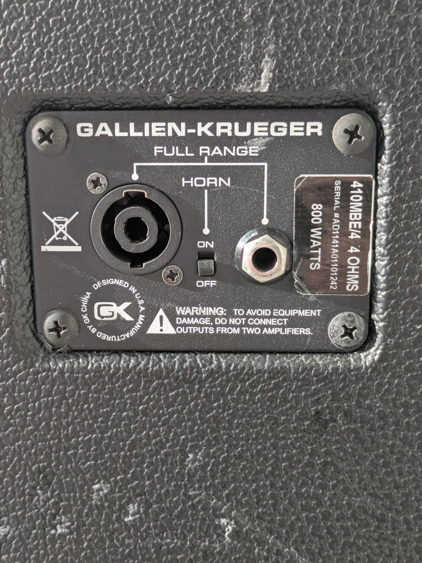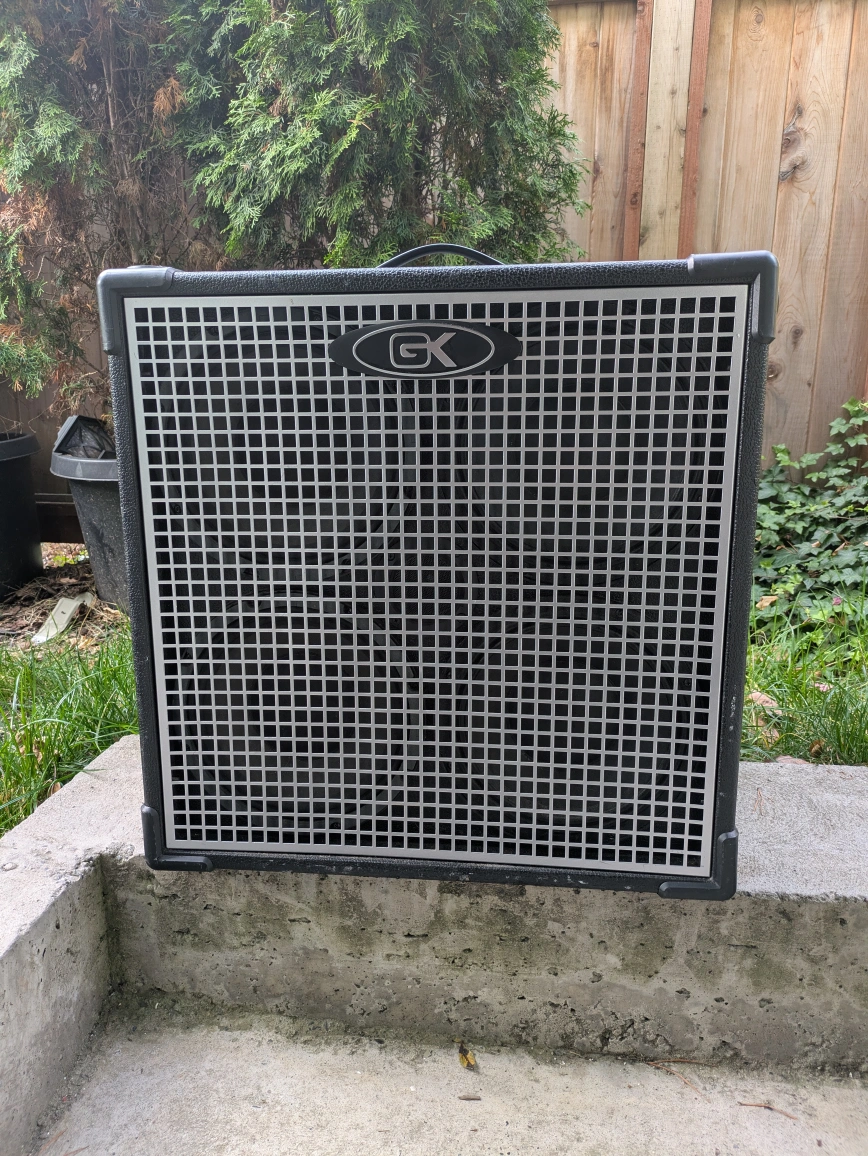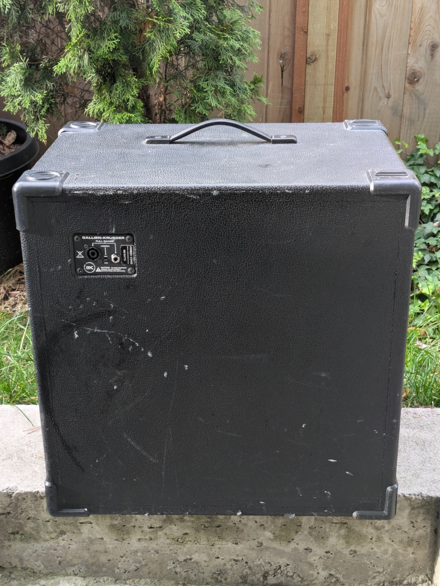 This bass cabinet is a reclamation project. There is some wear and tear on the bottom and back of the cab. The main issue is that the top left speaker requires repairs/replacement. Confirmed with GK that this is the replacement speaker: https://www.gallien-krueger.com/products/10-neo-woofer-32-ohm-97zn9 This cab helped me gig for the past 3 years and has played some larger rooms in Victoria. It's quite loud with the right amp head. Comparable modern models sold new are about $1300.00. Cash only.