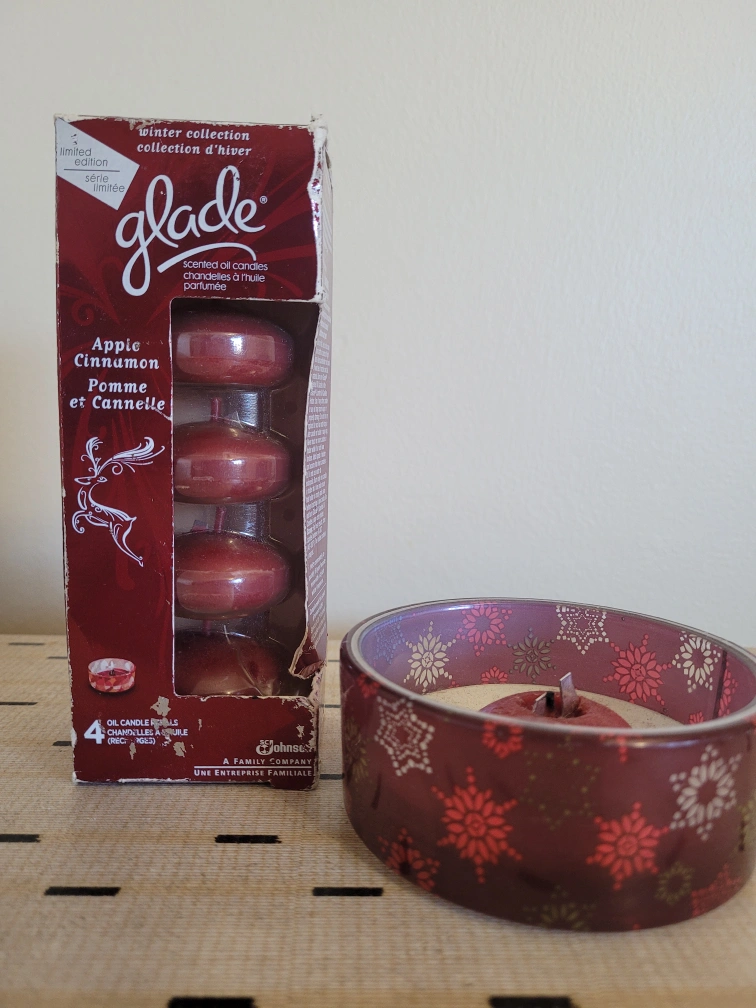 Glade apple cinnamon scented oil candles. 4 new in package candle replacement including candle holder Available for pick up nearby Finch Station