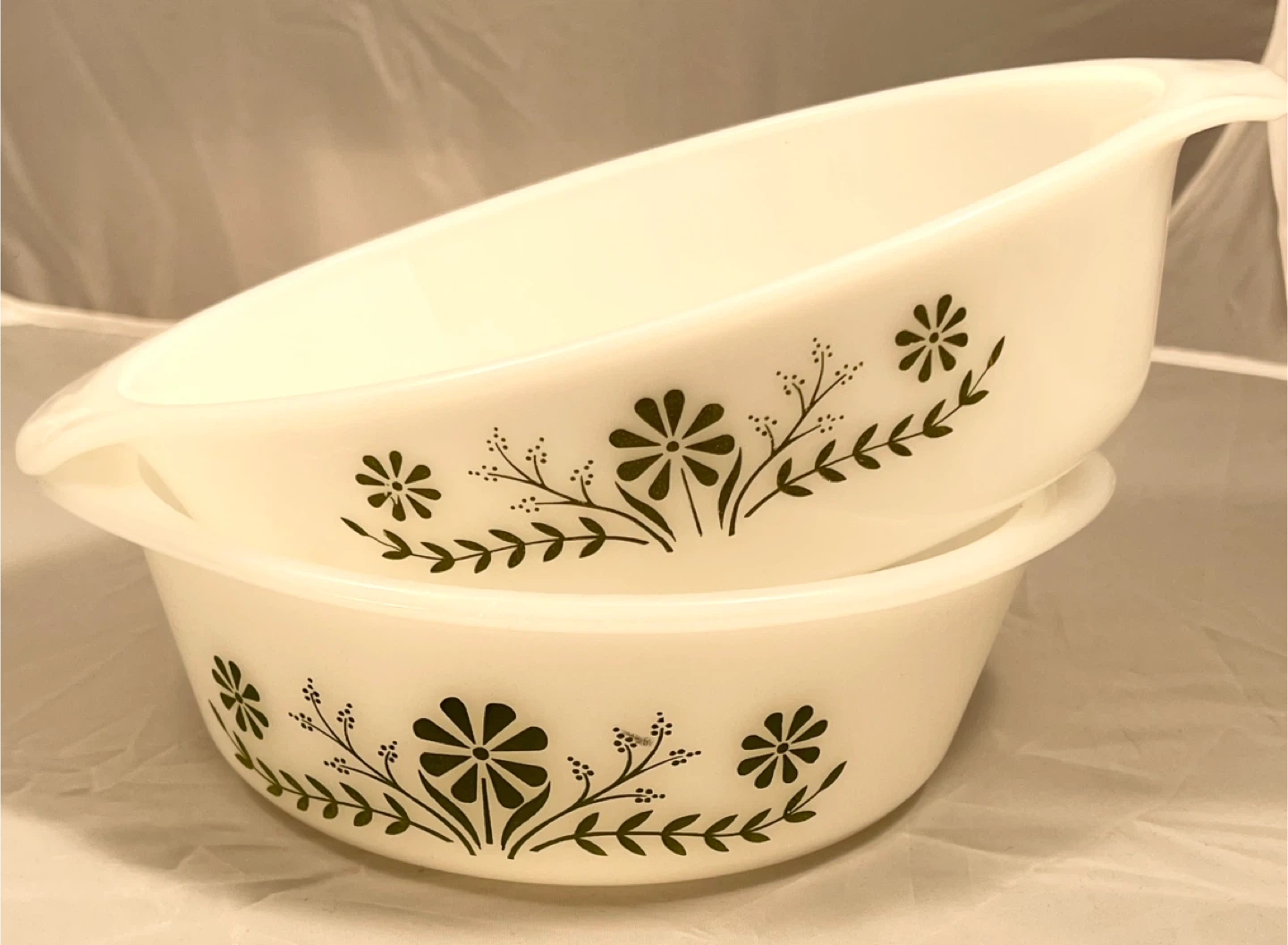 Selling a set of two Glasbake casserole dishes! These are made of white milk glass and feature a lovely green floral pattern. The larger dish is 2 quarts. They're perfect for baking and serving your favourite dishes