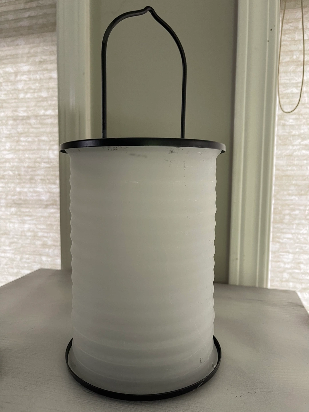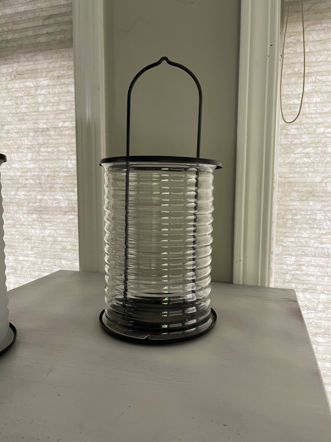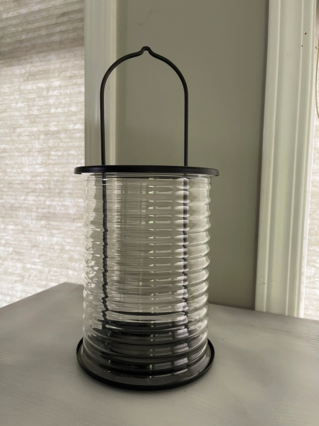 Selling a charming glass and metal lantern! It's in great shape and would look lovely in any room. The lantern has a ribbed glass design with a black metal frame and handle. It's perfect for adding a touch of cozy light to your home