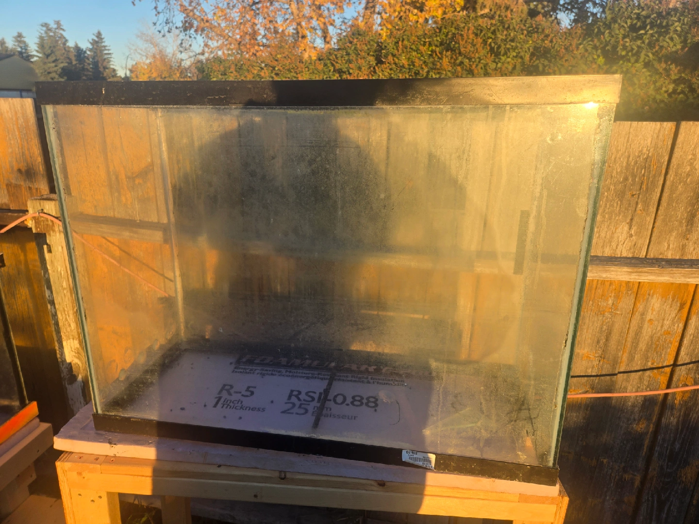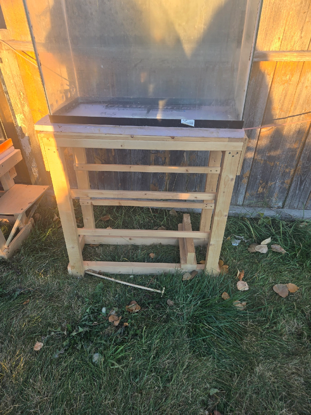 Selling a used glass aquarium tank that comes with a sturdy wooden stand. It's perfect for setting up a fish tank or terrarium. The tank appears to be in good condition, ready for a new home!