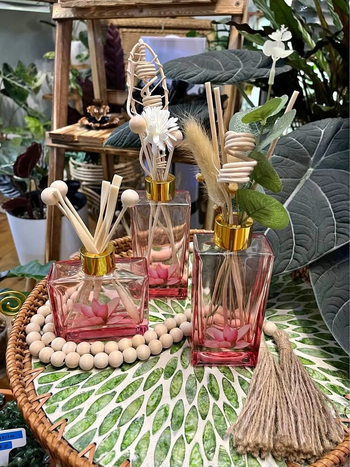 Pretty and Elegant Pink Glass Reed diffusers with a lotus design in the front. Available in tall or short and with a variety of different reeds and scents to go along with it. Available scents in 30ml glass bottles are: Sandalwood Sweet Orange Bergamot Ylang Ylang Jasmine Pick up at The Plant Witch in Erin Ridge, St.Albert Check out my other listings or go to my website theplantwitch.ca to view all my listings for different potted plant varieties, suncatchers, propagation jars, decorative pot stakes and more! 🪴🌞