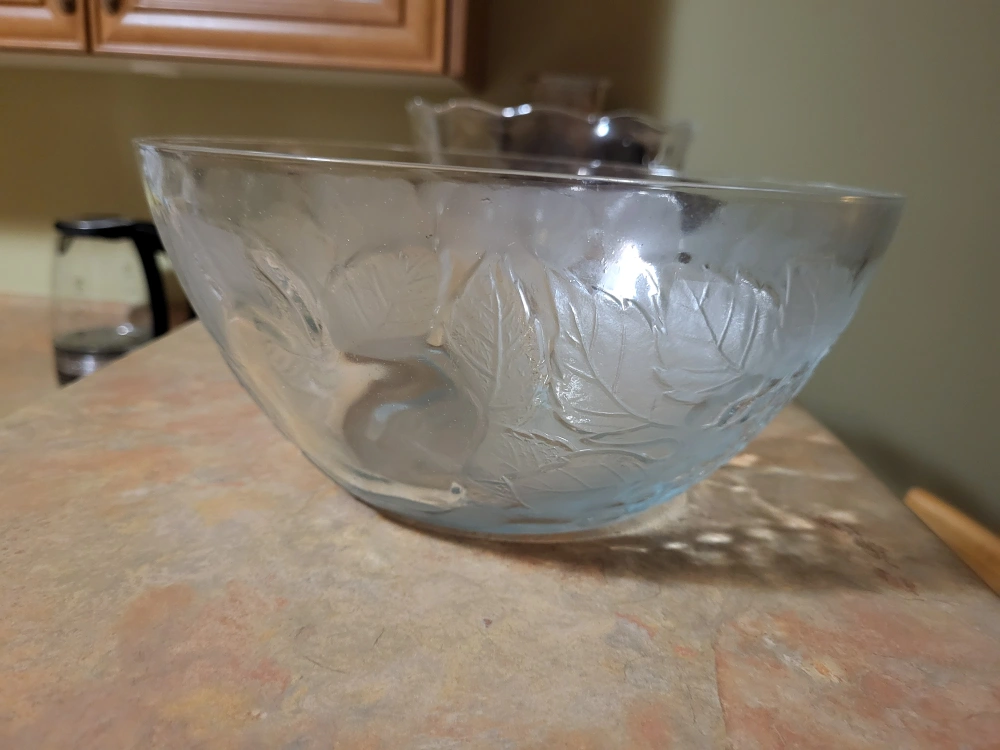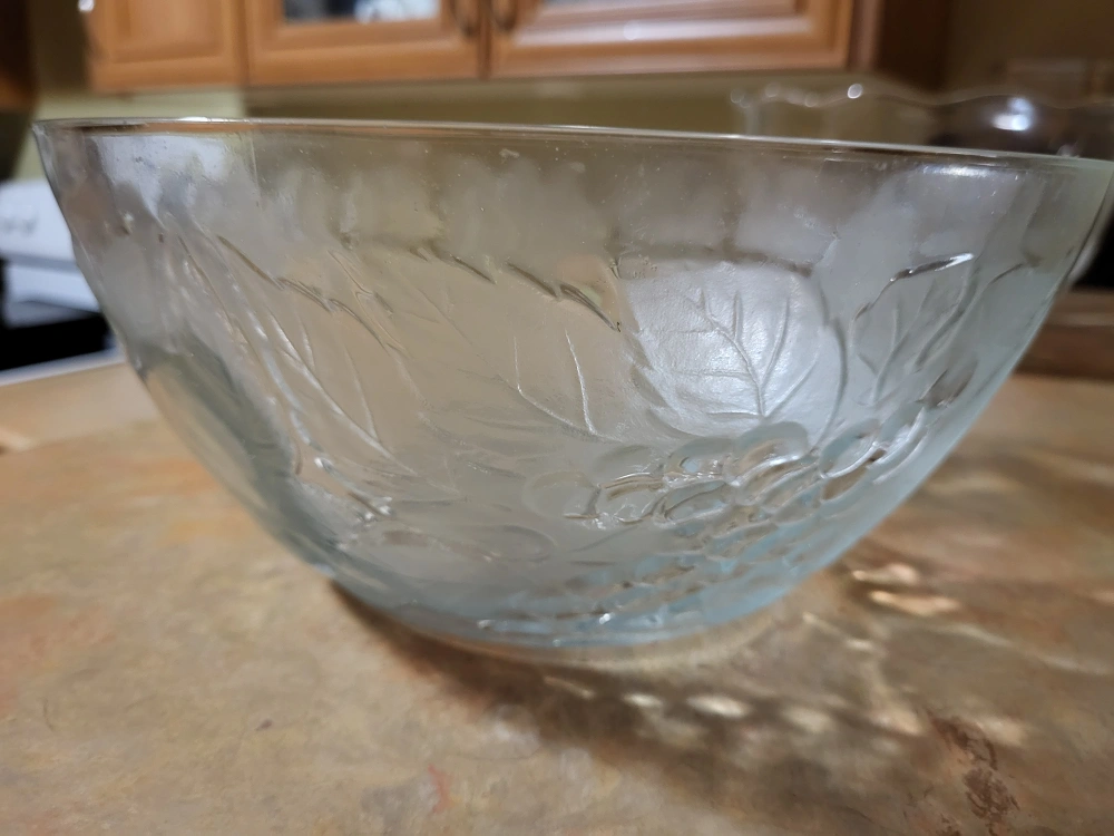 Selling a lovely glass bowl featuring a delicate leaf design. It's perfect for serving salads, snacks, or as a decorative piece in your kitchen or dining area. It is in great condition and ready for a new home!