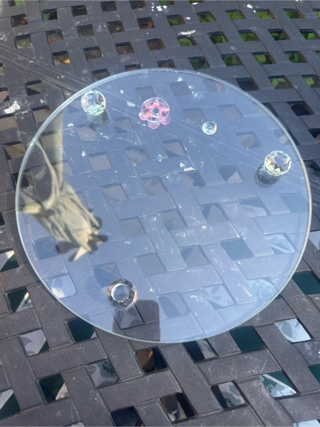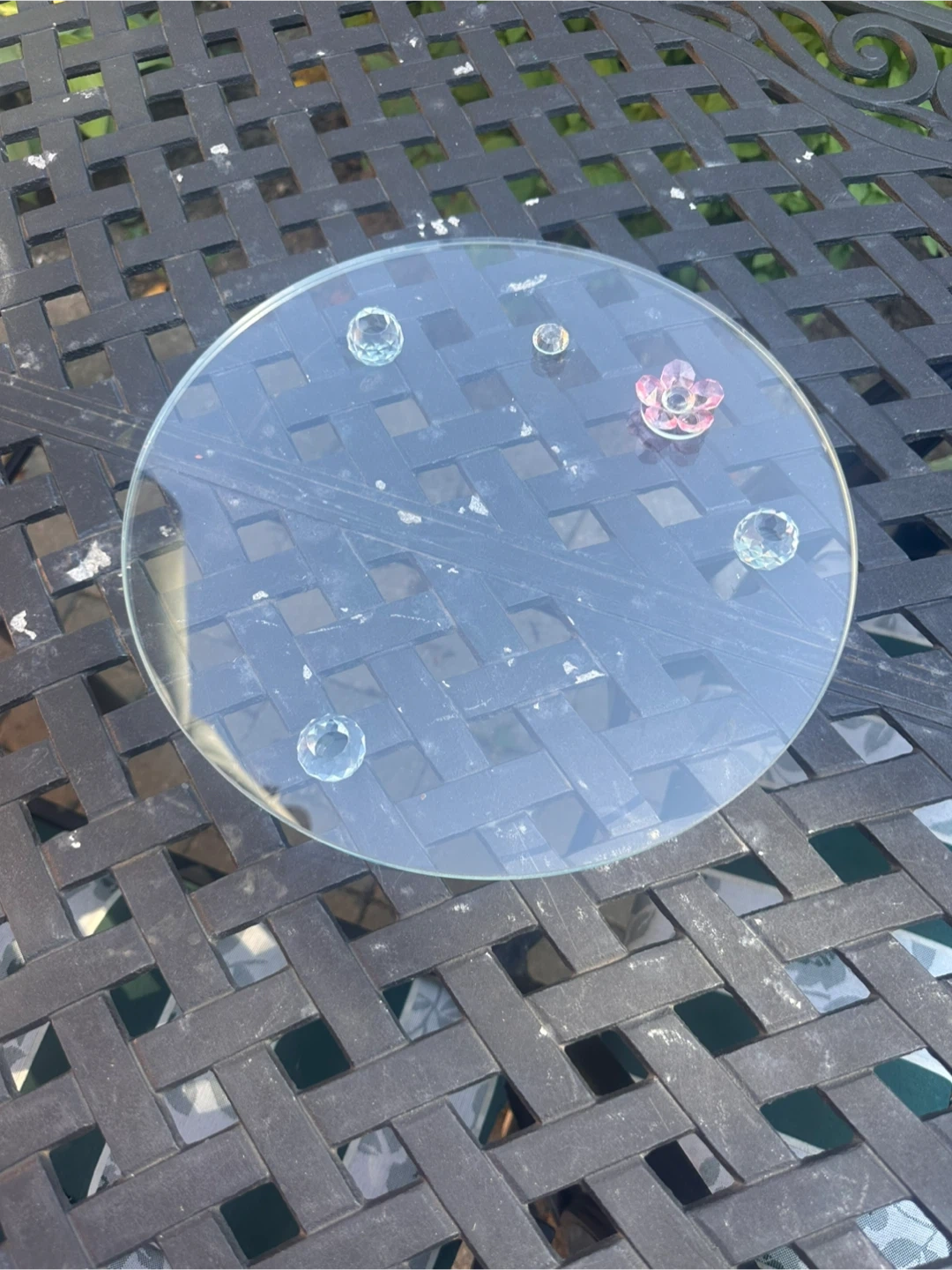 Selling a lovely glass cake stand that will add a touch of elegance to your desserts! It features delicate crystal accents that catch the light beautifully. Perfect for displaying cakes, cupcakes, or other treats for any occasion. It's in good condition and ready to be the centerpiece of your next gathering