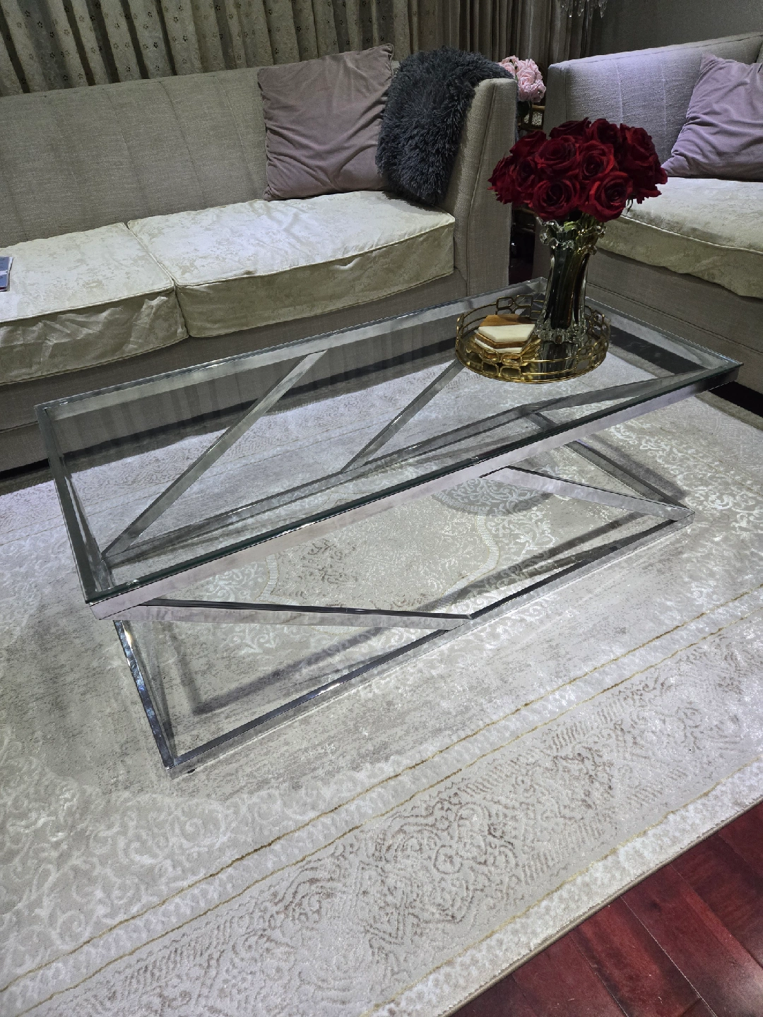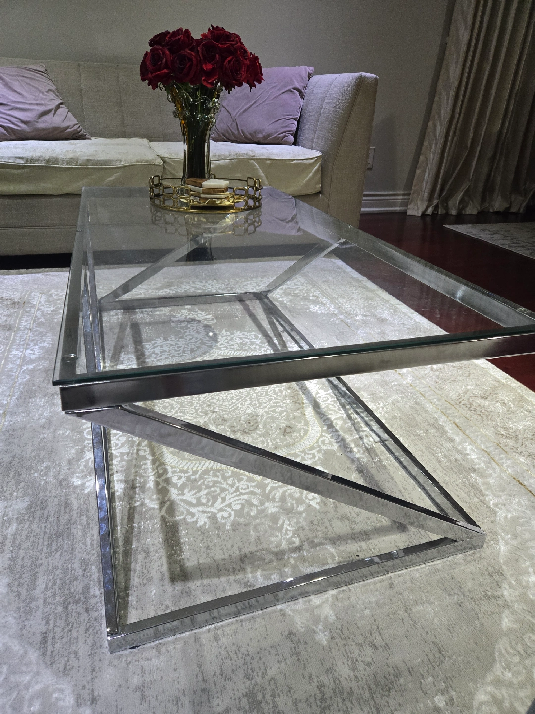 Selling a stylish glass coffee table featuring a modern chrome frame! It's in great condition and would be a lovely addition to any living room. The clear glass top allows for a clean and open feel, while the chrome frame adds a touch of elegance. please text me 647-720-2205 for more info.