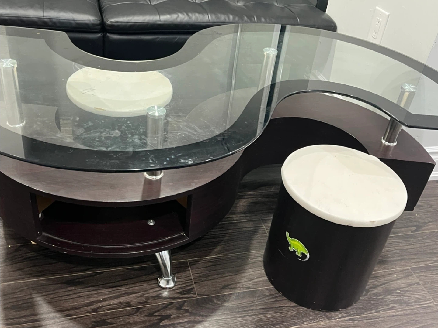 Selling a stylish glass coffee table with a unique, eye-catching design! It features a clear glass top with a black trim and a dark wood base. It also comes with two small stools that fit nicely underneath the table. Perfect for adding a modern touch to your living room