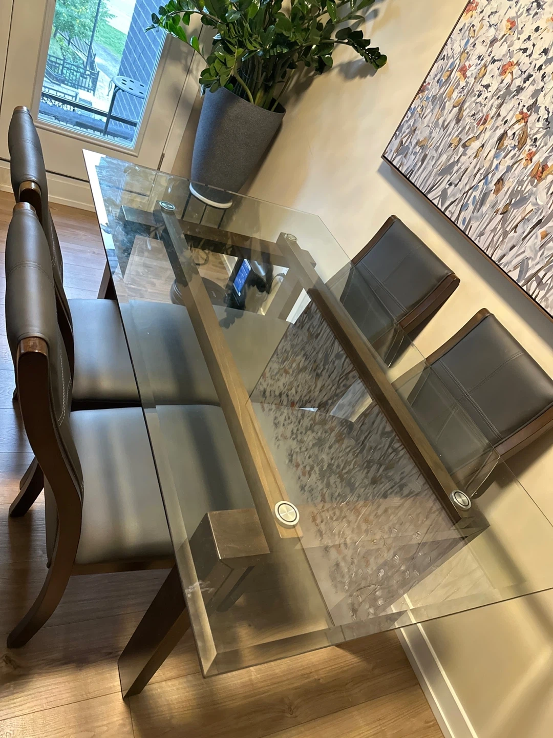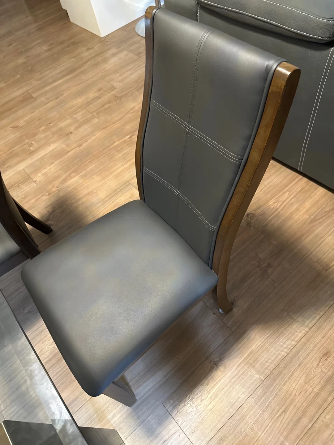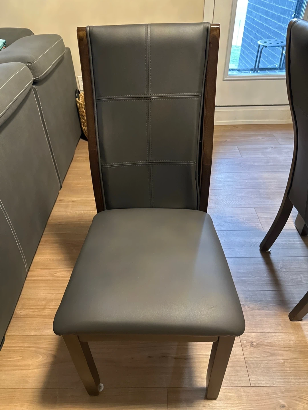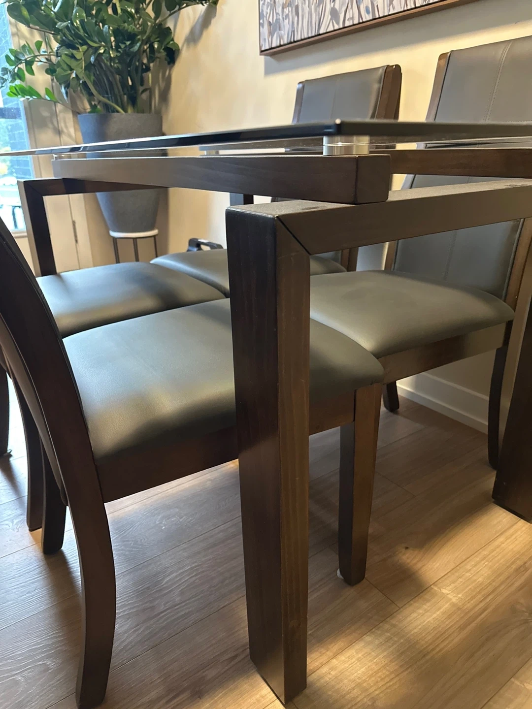 Selling a dinning set with 4 chairs. They feature a dark wood frame with grey leather seats and backs. They're in great shape and would look great in any dining room! Glass top is detachable.
