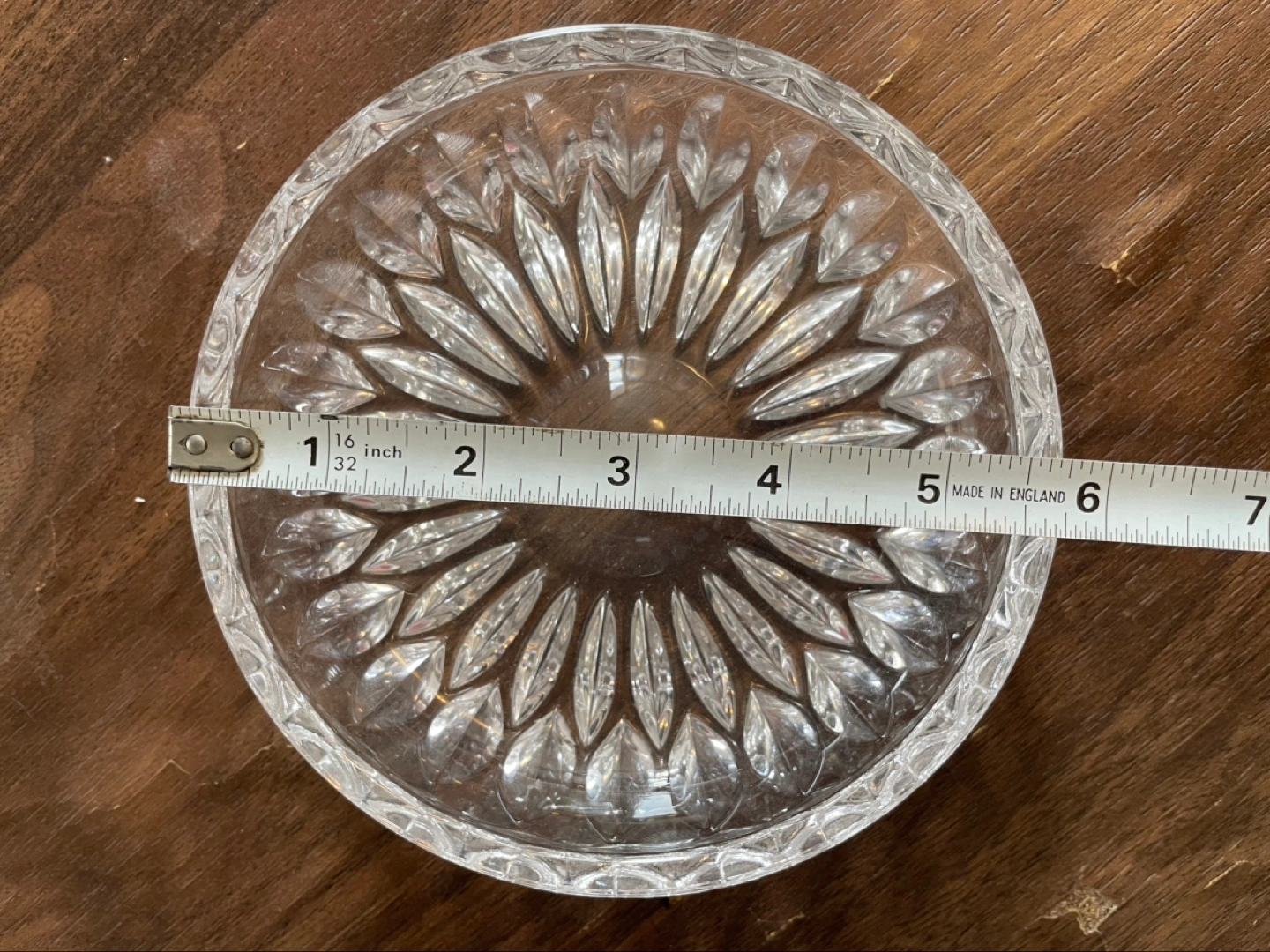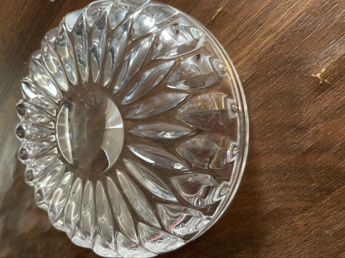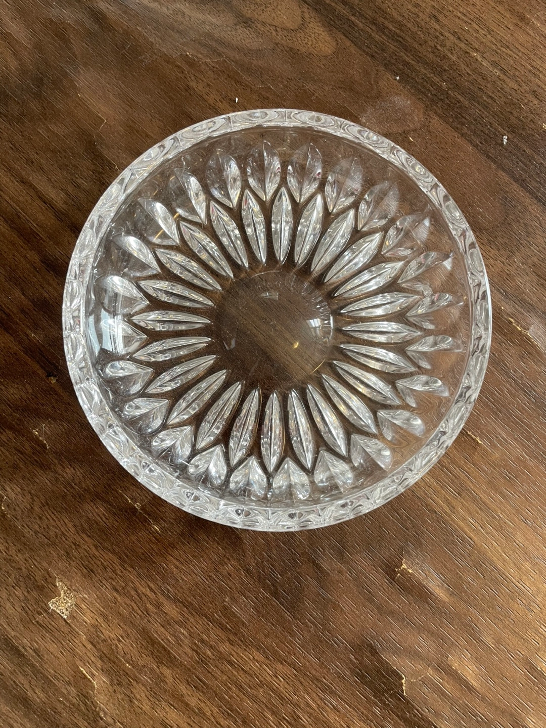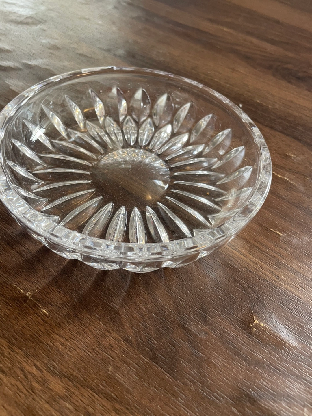 Small, clear glass dish. Intricate cut design. Measures approximately 6 inches in diameter. Perfect for jewellery, trinkets, or as a decorative accent. Or for serving dips or pickles on the dining table etc Great condition. No chips. Pick up near Yonge and eglinton