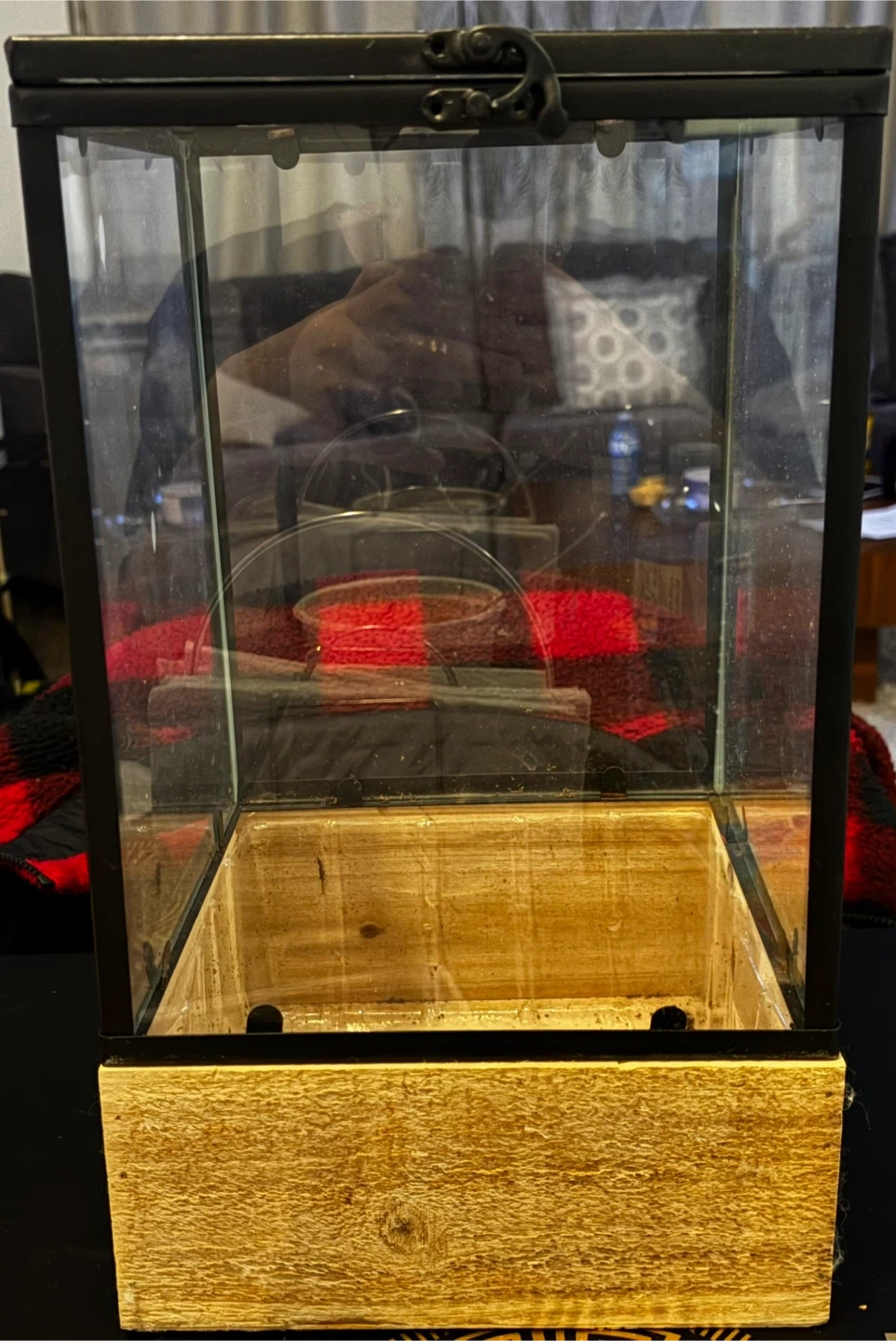 Selling a glass display case with a wooden base. It's perfect for showcasing collectibles or adding a decorative touch to your space. The case features a black metal frame and a latch closure.
