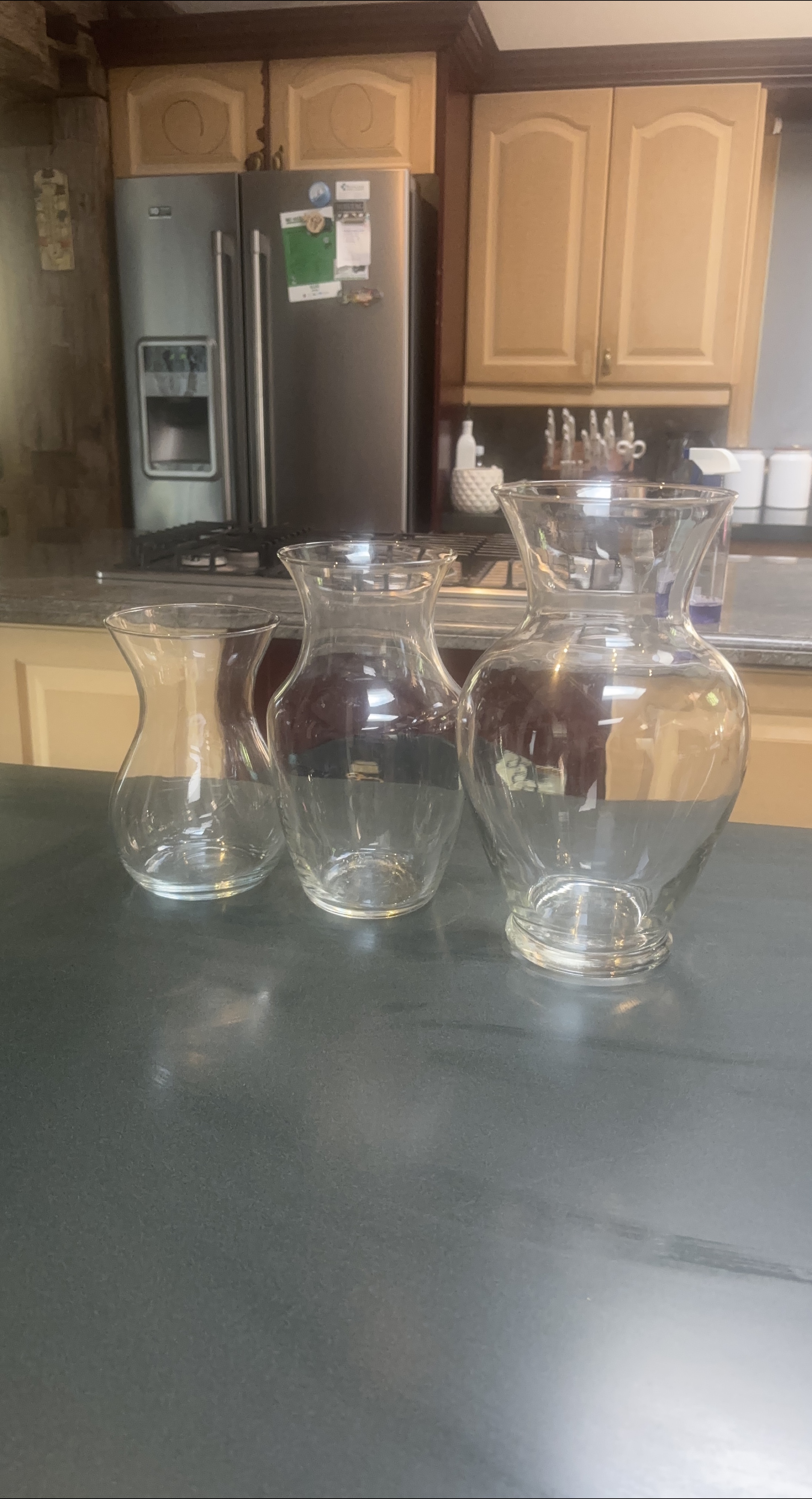 Selling a set of three clear glass flower vases. They're in great shape and ready to brighten up your space!