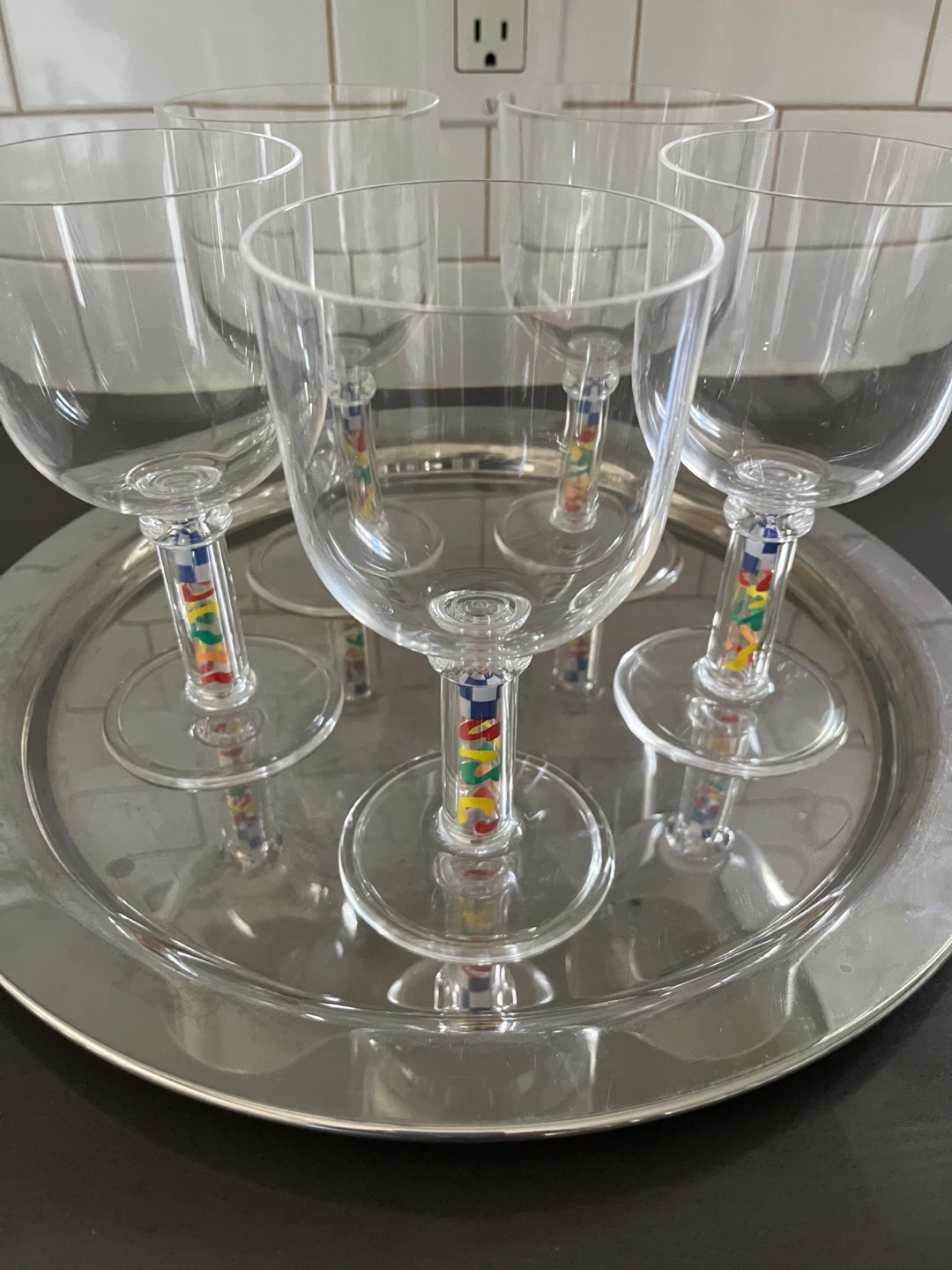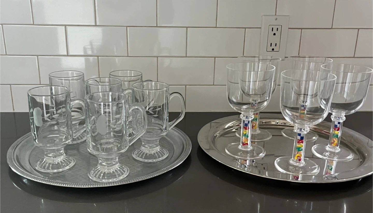 Selling a set of 6 clear glass mugs, 5 Plastic wine glasses with 2 silver trays. They're in great condition and ready to find a new home! Price is for all.
