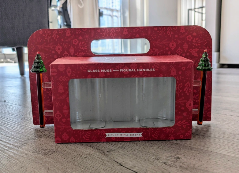 Selling a set of two glass mugs with figural handles. These mugs are 14 fl oz (414 mL) each. Perfect for adding a festive touch to your drinks!