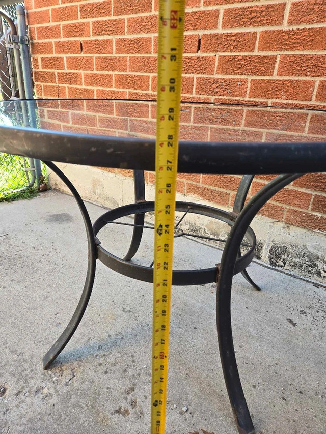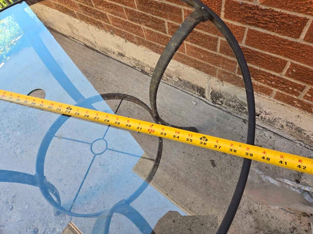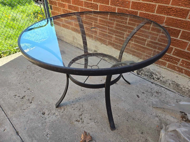 This used outdoor glass table is perfect for a small patio or balcony, featuring a 40-inch diameter glass top and sturdy metal frame. Fully functional and ready to use. * **Diameter:** 40 inches * **Height:** 29 inches * **Material:** Glass top, metal frame Just a friendly note: if the ad is up, it's still available!