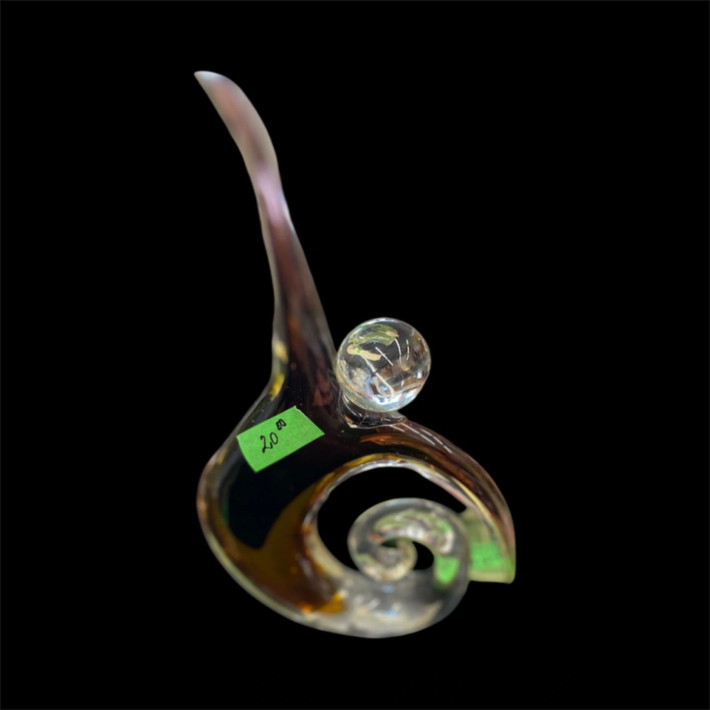 Selling a unique glass sculpture featuring a beautiful swirl design and a clear glass ball accent. It's in great condition and would make a lovely addition to any home decor. It has a sticker that says $20.00.