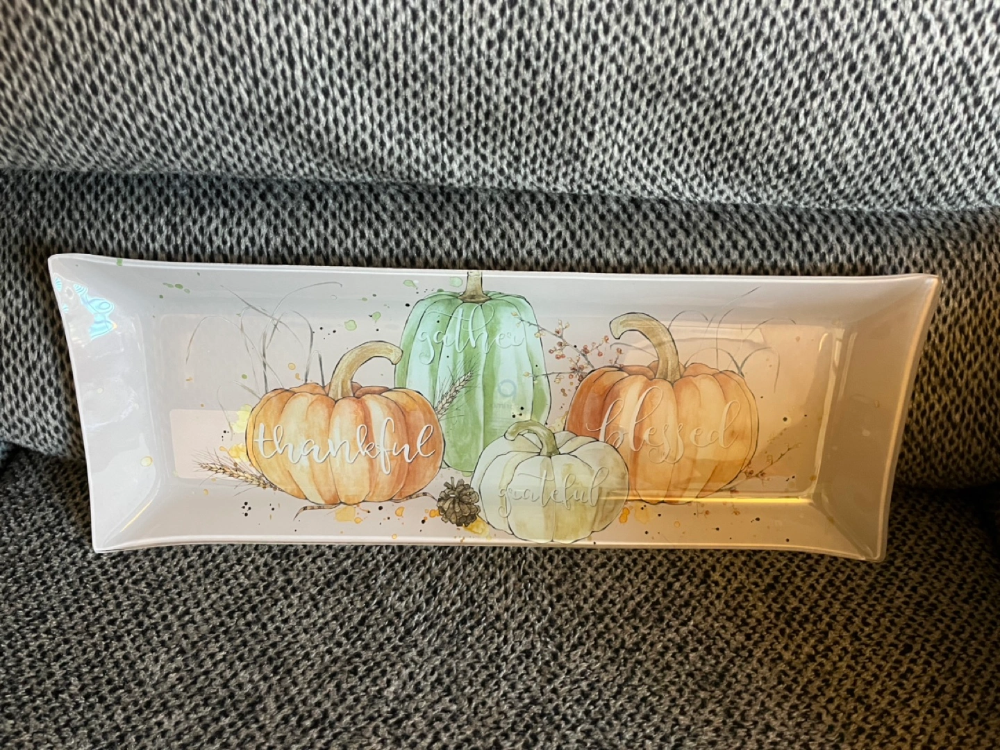 Rectangular glass serving tray with a fall design featuring pumpkins and words (thankful, gather, grateful, blessed).