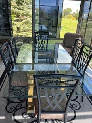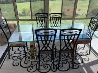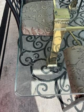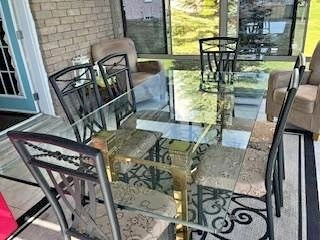 Glass table with Brass Base measuring 6'8" long x 42" wide and glass is 1" thick. Seats 6 people comfortably. Chairs are black metal. Table has a chip on the underside of one corner. Very heavy. Buyer must have ability to carry down 4 steps to yard and around to front of house. Location: 15 minutes north of Port Perry off Simcoe Street in Seagrave.
