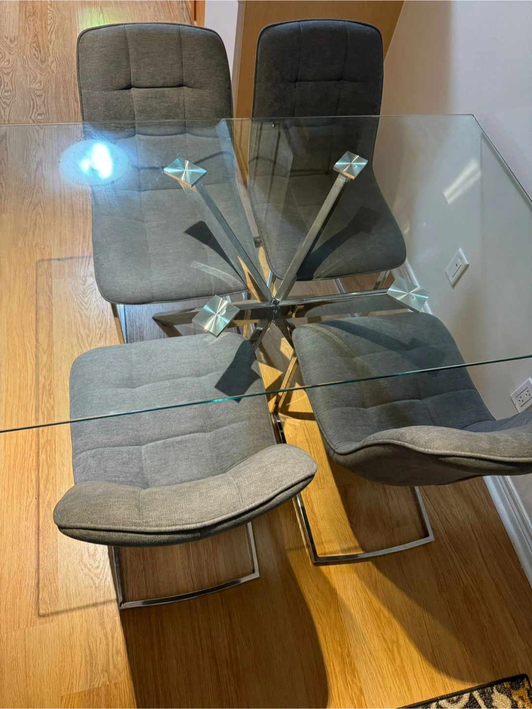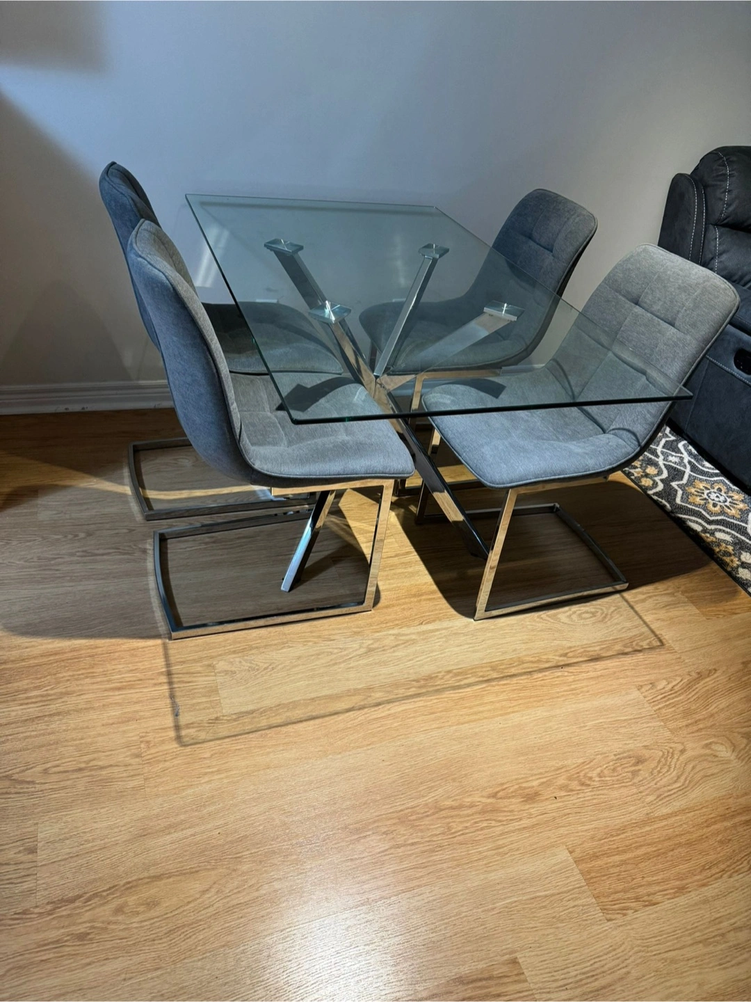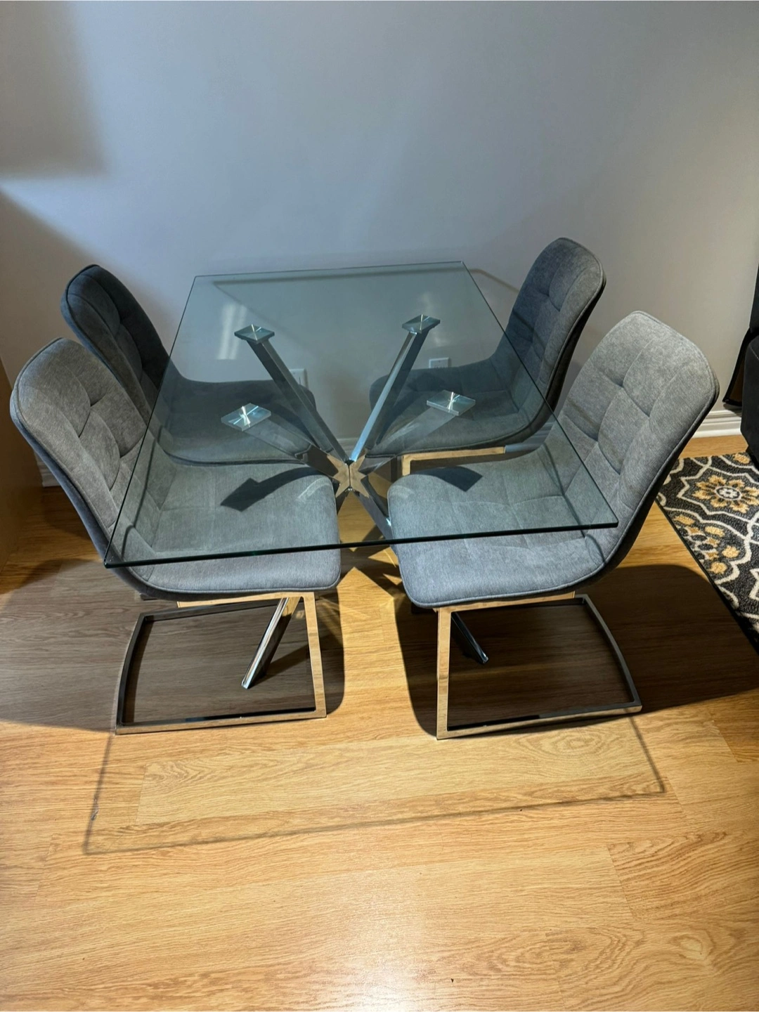 **FOR SALE: 5-Piece Modern Glass Dining Set – Table + 4 Chairs** Includes: 1 Darron Glass Dining Table (Table from Leon’s) -Strong tempered glass top – more durable and safer than regular glass -Sleek, smooth edges – no sharp corners -Polished metal base – adds a contemporary touch -Easy to clean and keeps its shine for years -Size:** 55” L x 34” W x 30” H 4 Graphite Chairs (from Leon’s) -Comfortable and supportive with a modern look -Chair Dimensions: 18″ W x 34.5″ H x 23.25” D Condition: Excellent – gently used and well cared for. Perfect for: Modern homes, condos, or anyone looking for a stylish dining upgrade. Pick-Up ONLY in Etobicoke. Message me if you're interested or want more info!