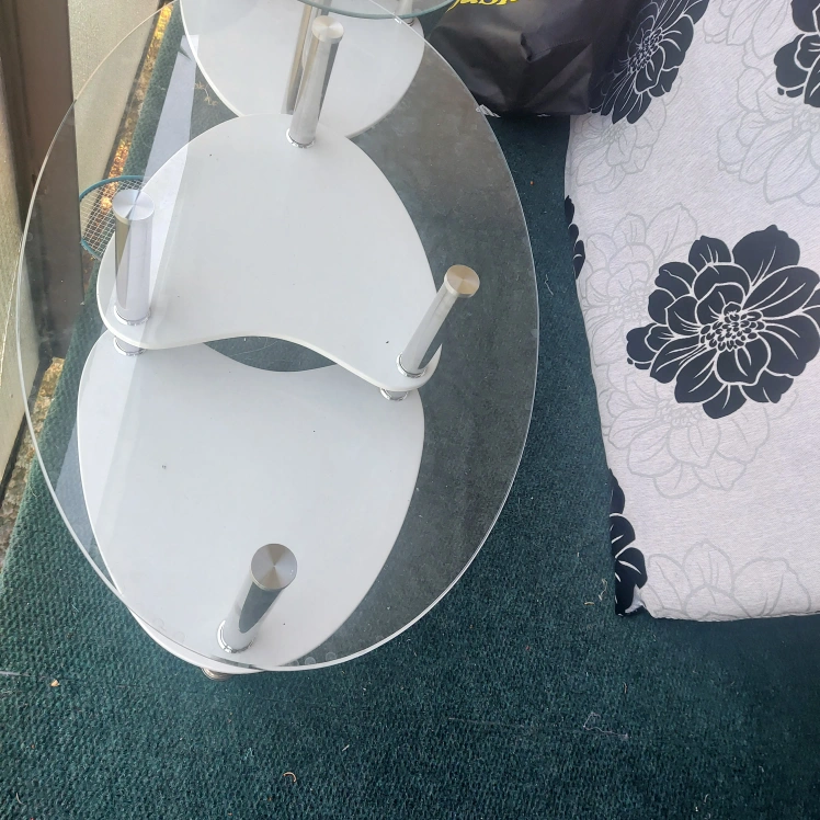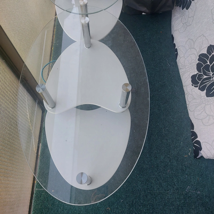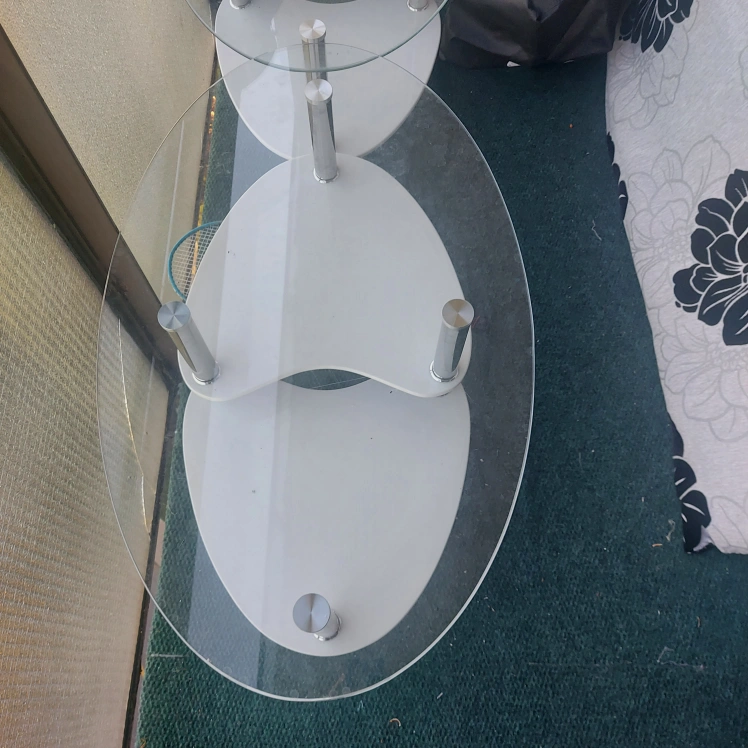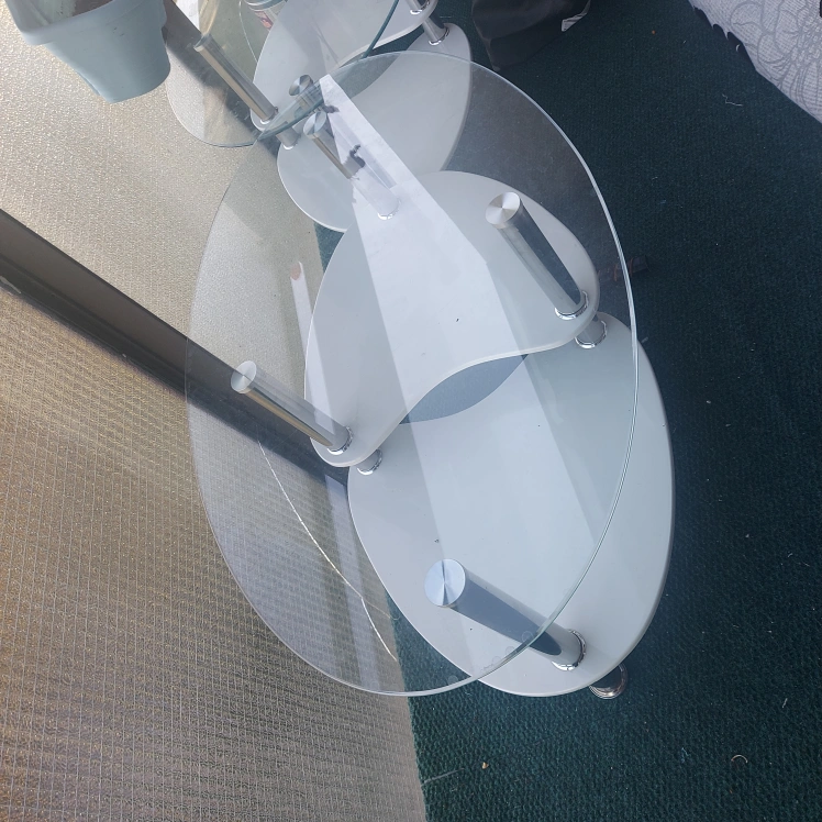Selling a unique glass tiered coffee table! It features a modern design with multiple oval-shaped glass surfaces stacked on top of each other, supported by metal legs. It's perfect for adding a touch of elegance to your living room or den