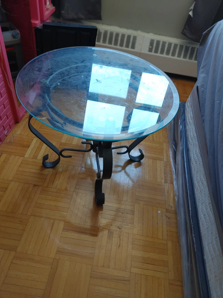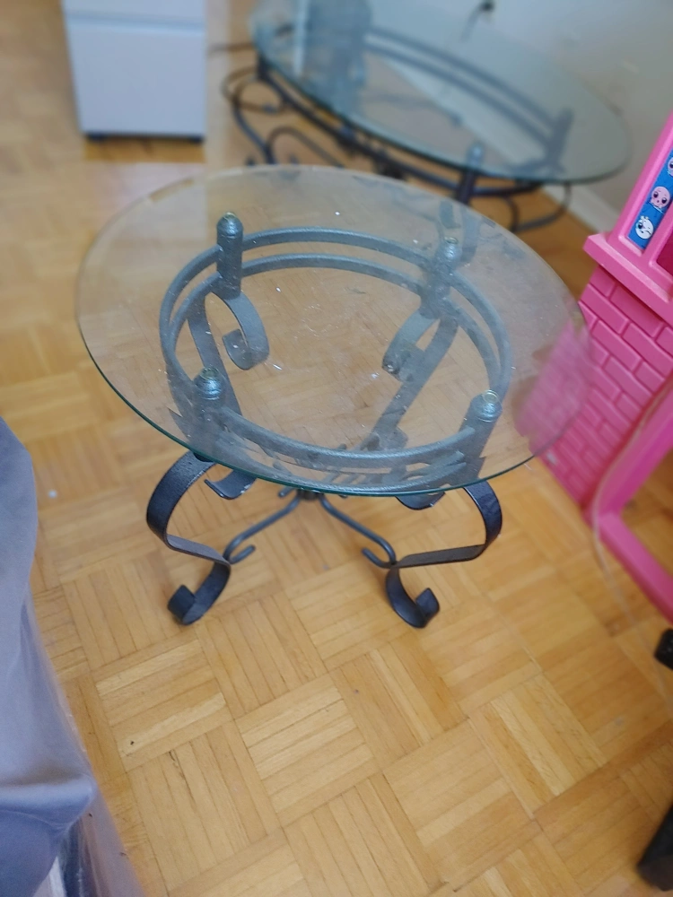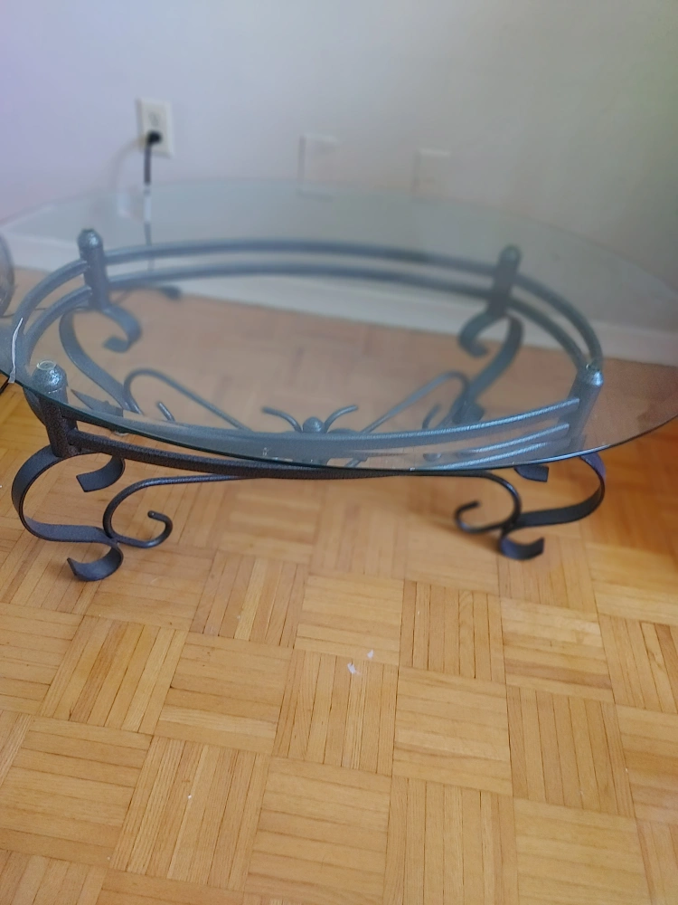 Selling a glass top accent table with a wrought iron base. It's in great shape and would look lovely in any living room or bedroom Oval coffee table 45 x 32 x 17 - 30$ 2 Round side table 29 diameter 21 tall - 25$ each