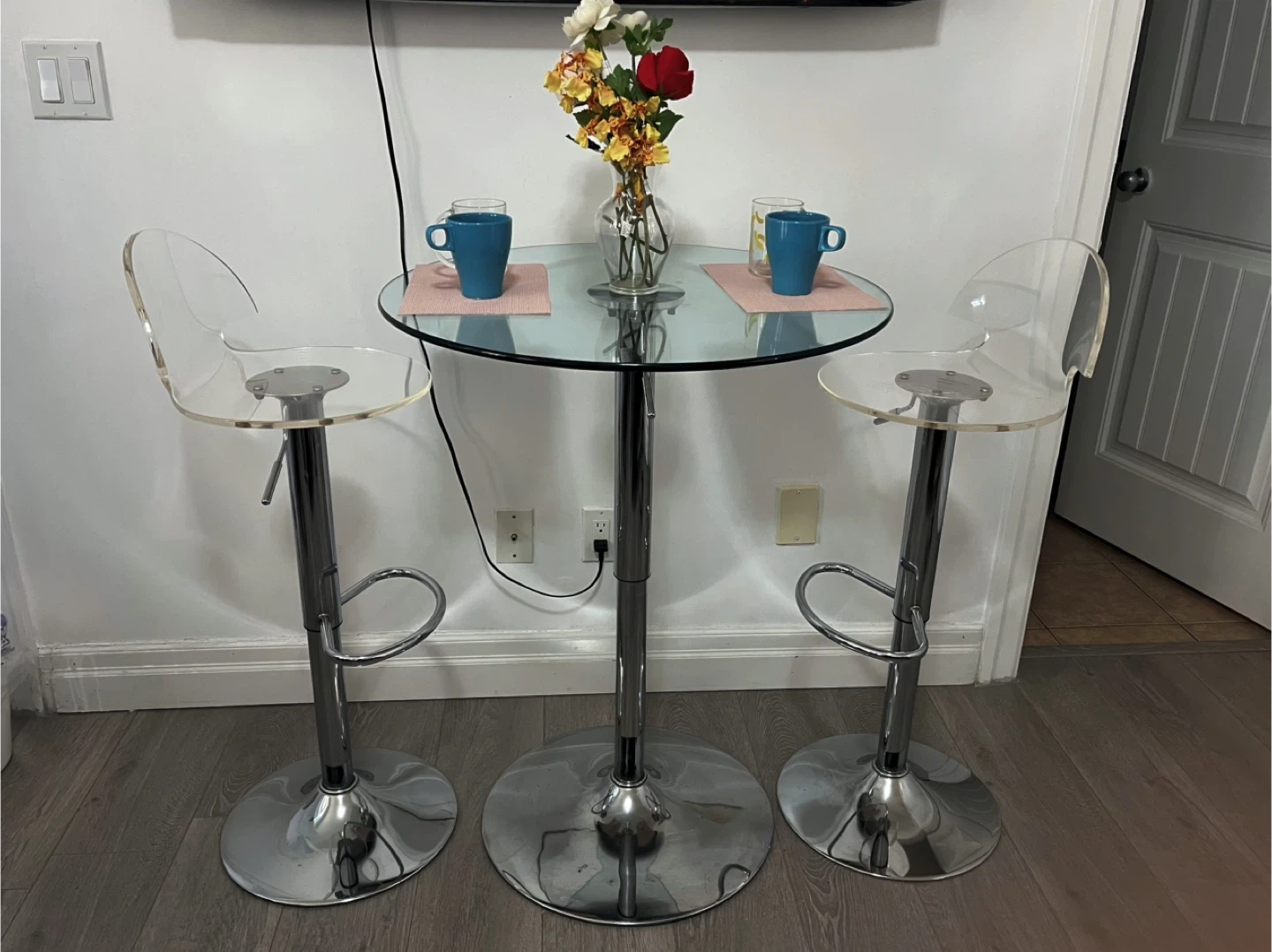 Glass Top Bar Table with 2 Acrylic chairs,delivery available