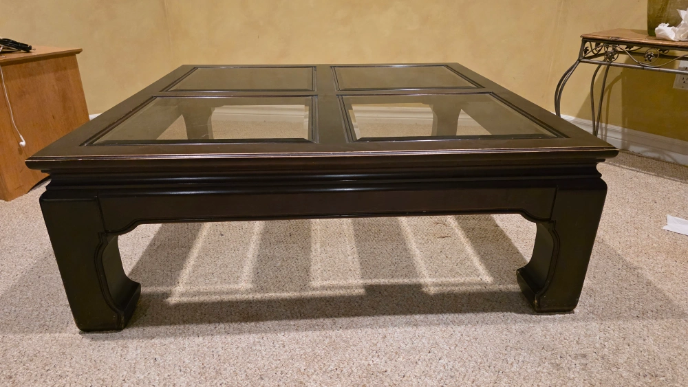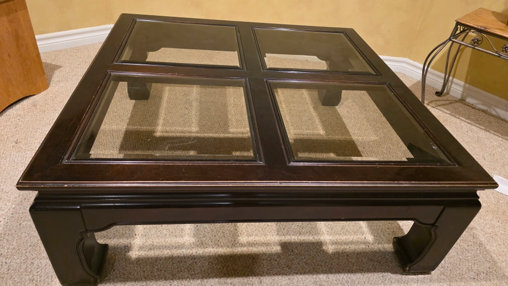 A stylish coffee table with a glass top, perfect for adding a touch of elegance to your living room. The dark wood frame complements the glass nicely. It's in great condition and ready for a new home