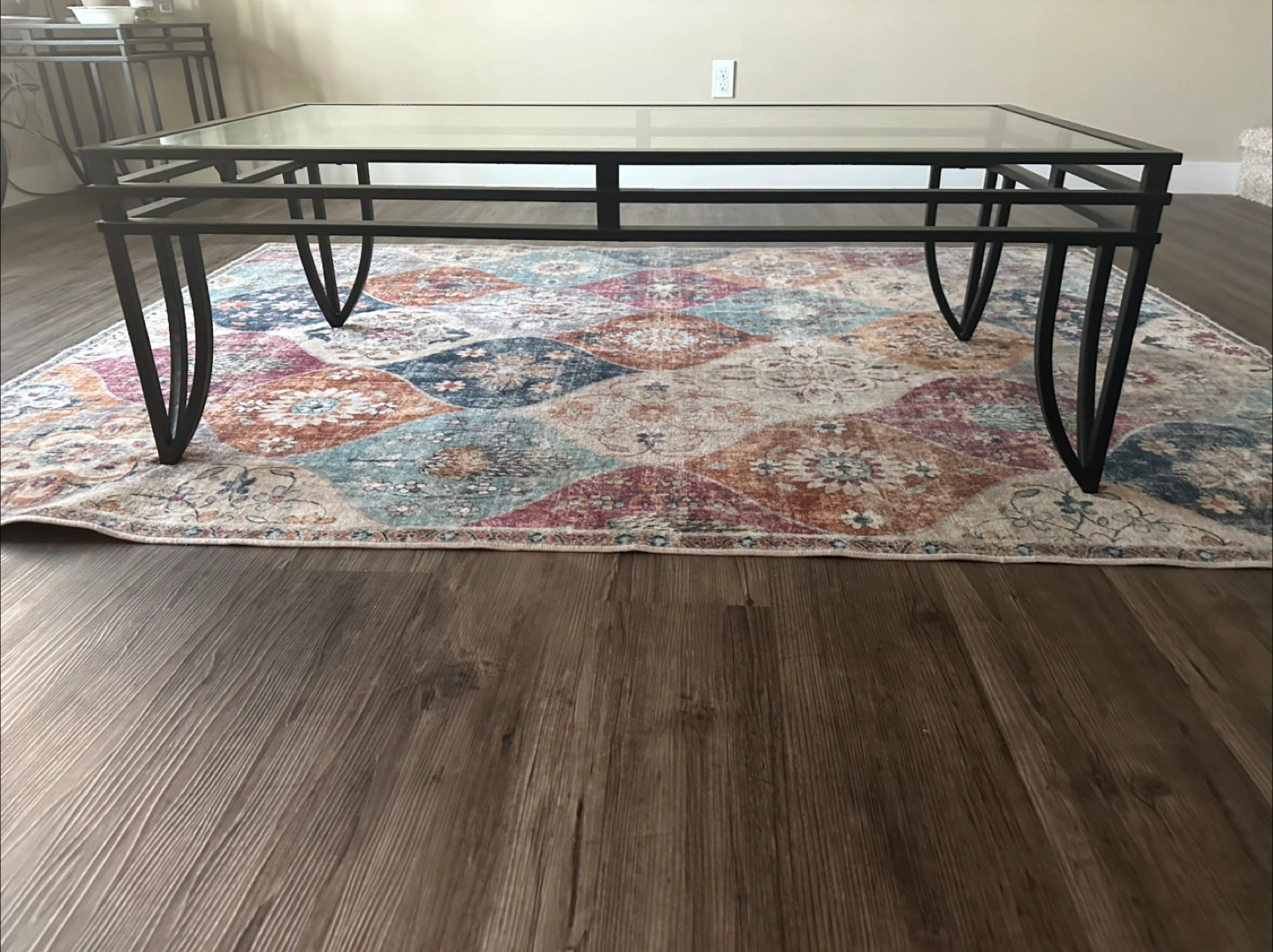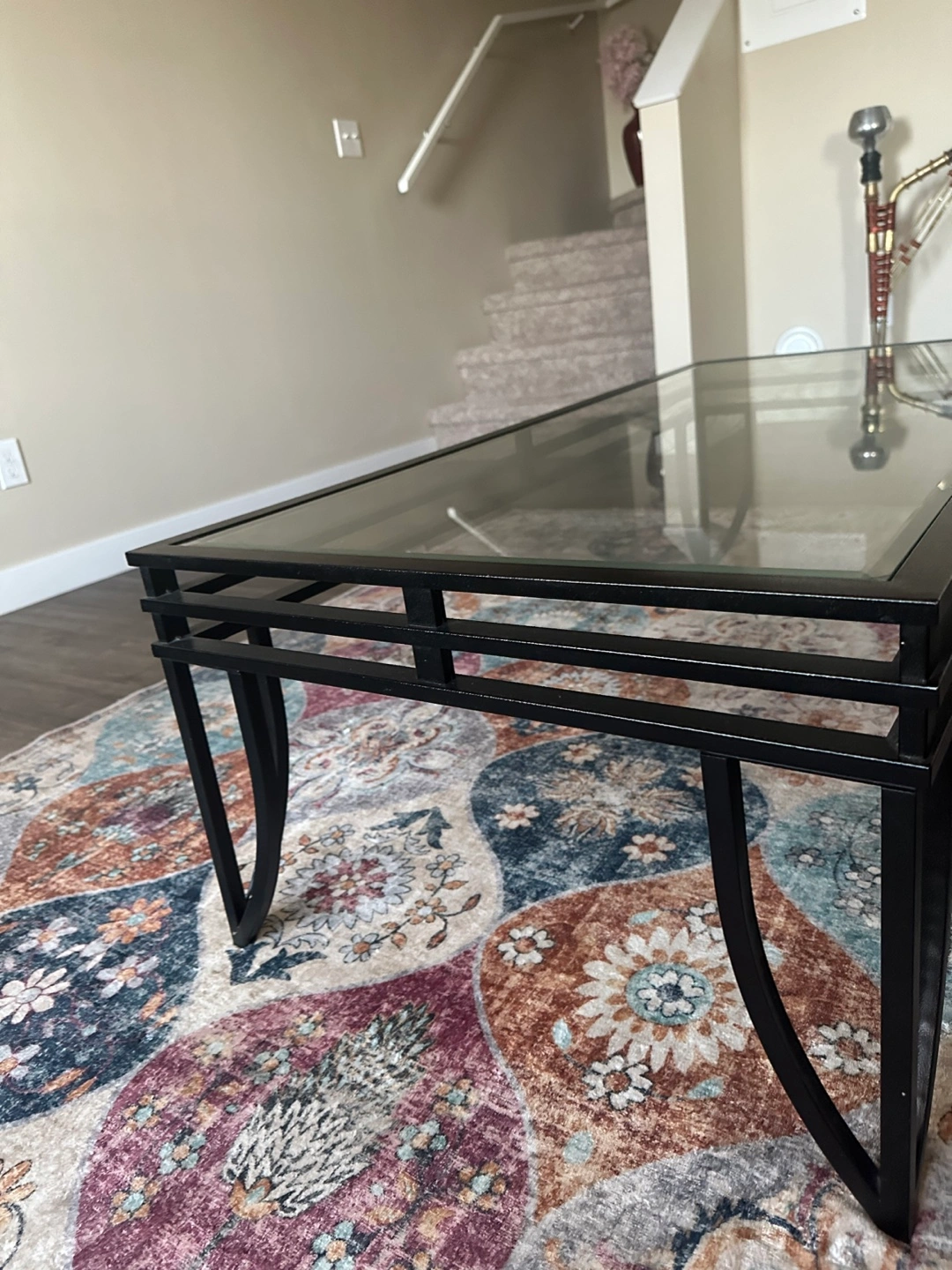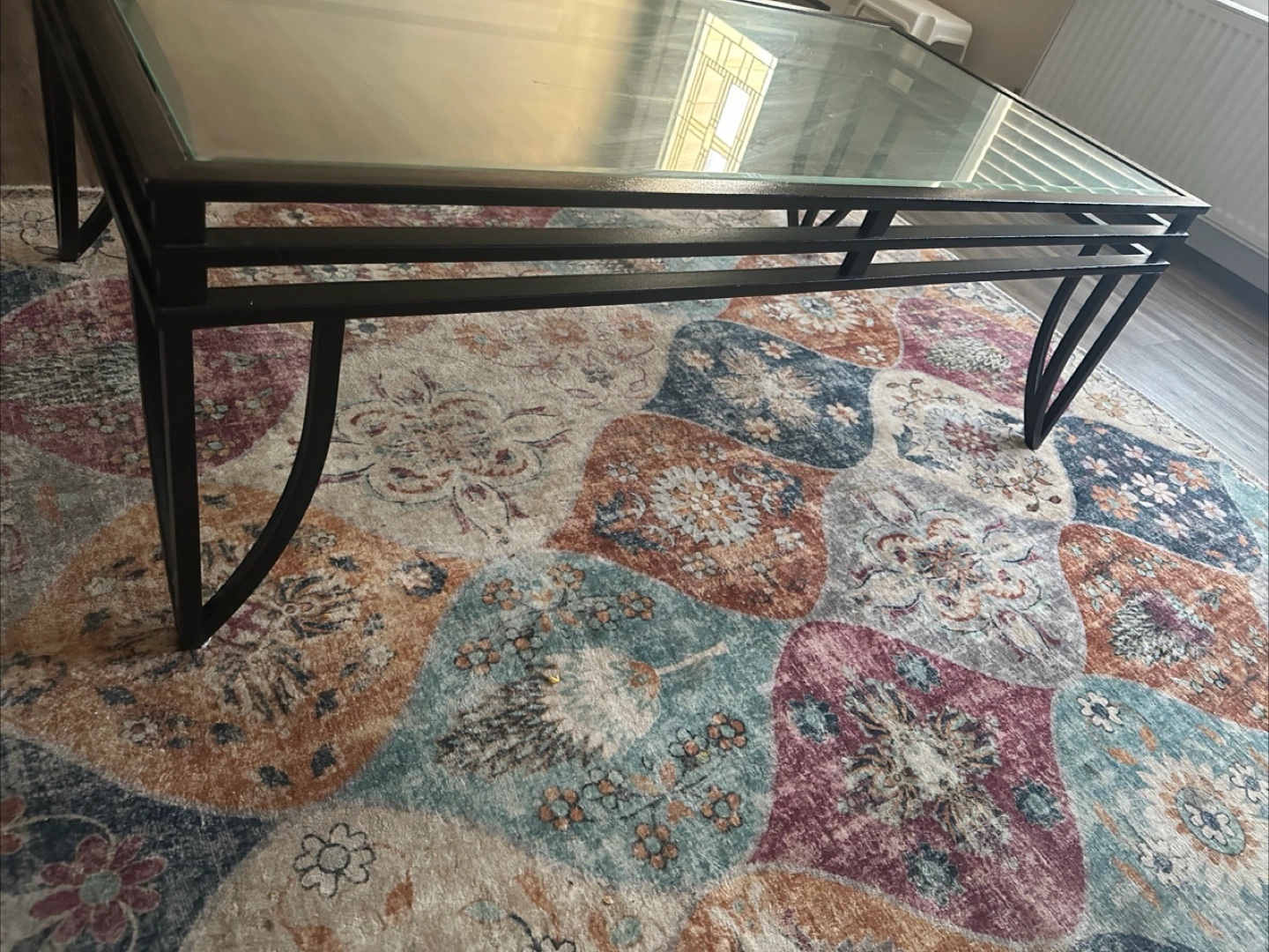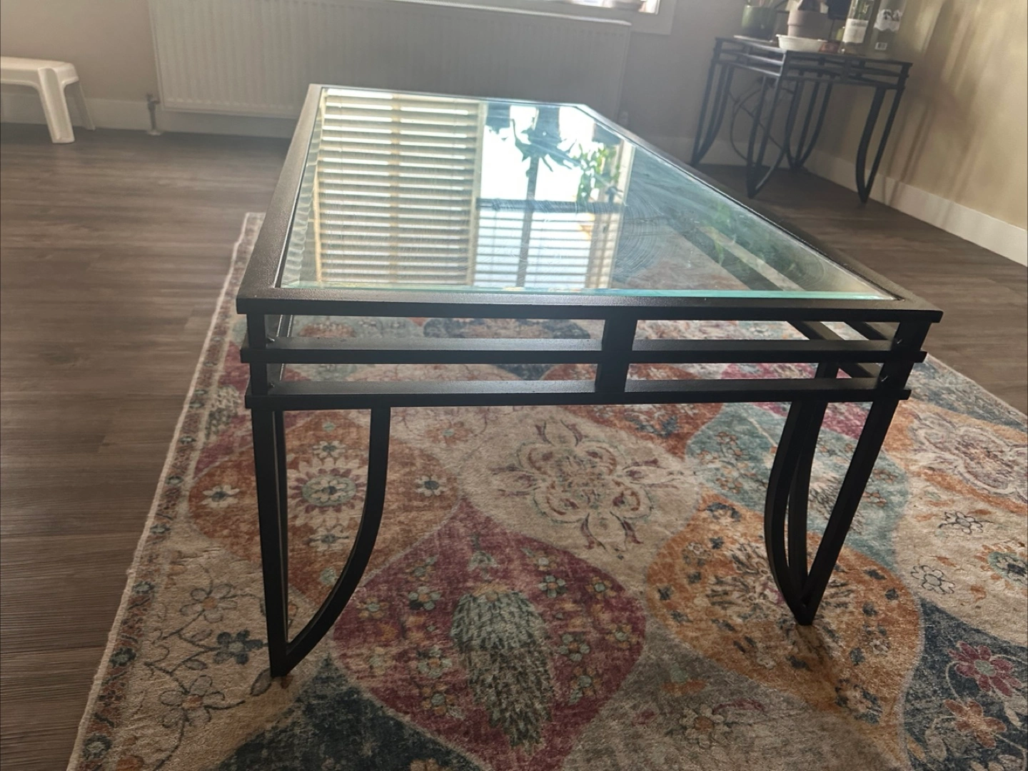 Selling a glass top coffee table with a black metal frame It's in great condition and would look lovely in any living room. The sleek design adds a modern touch to your space as we are moving needs to go as soon as possible.It's a stylish set that would look great in any living room. The coffee table are the perfect size .They are in good condition and ready for a new home. Can be negotiate for serious buyer.