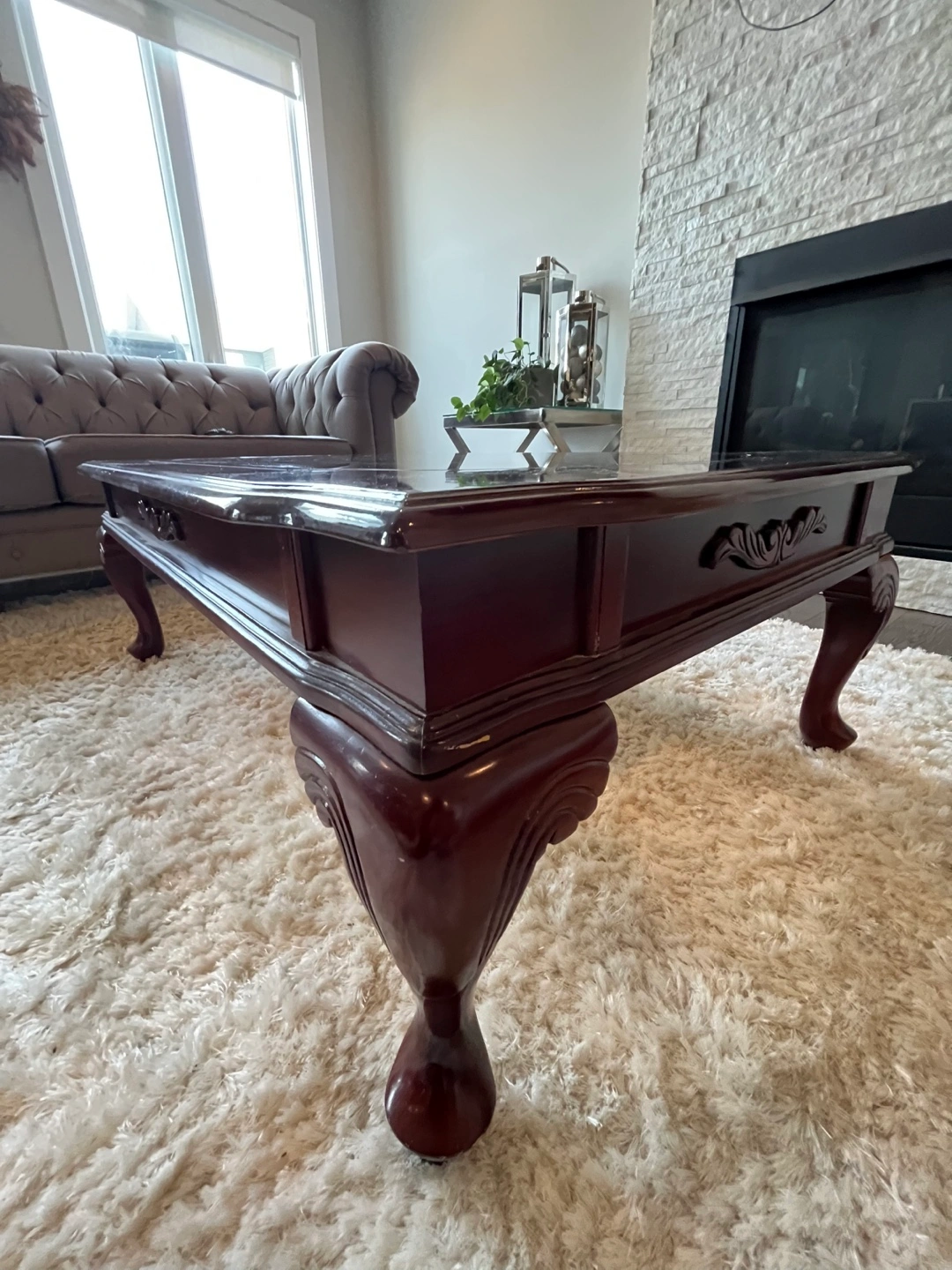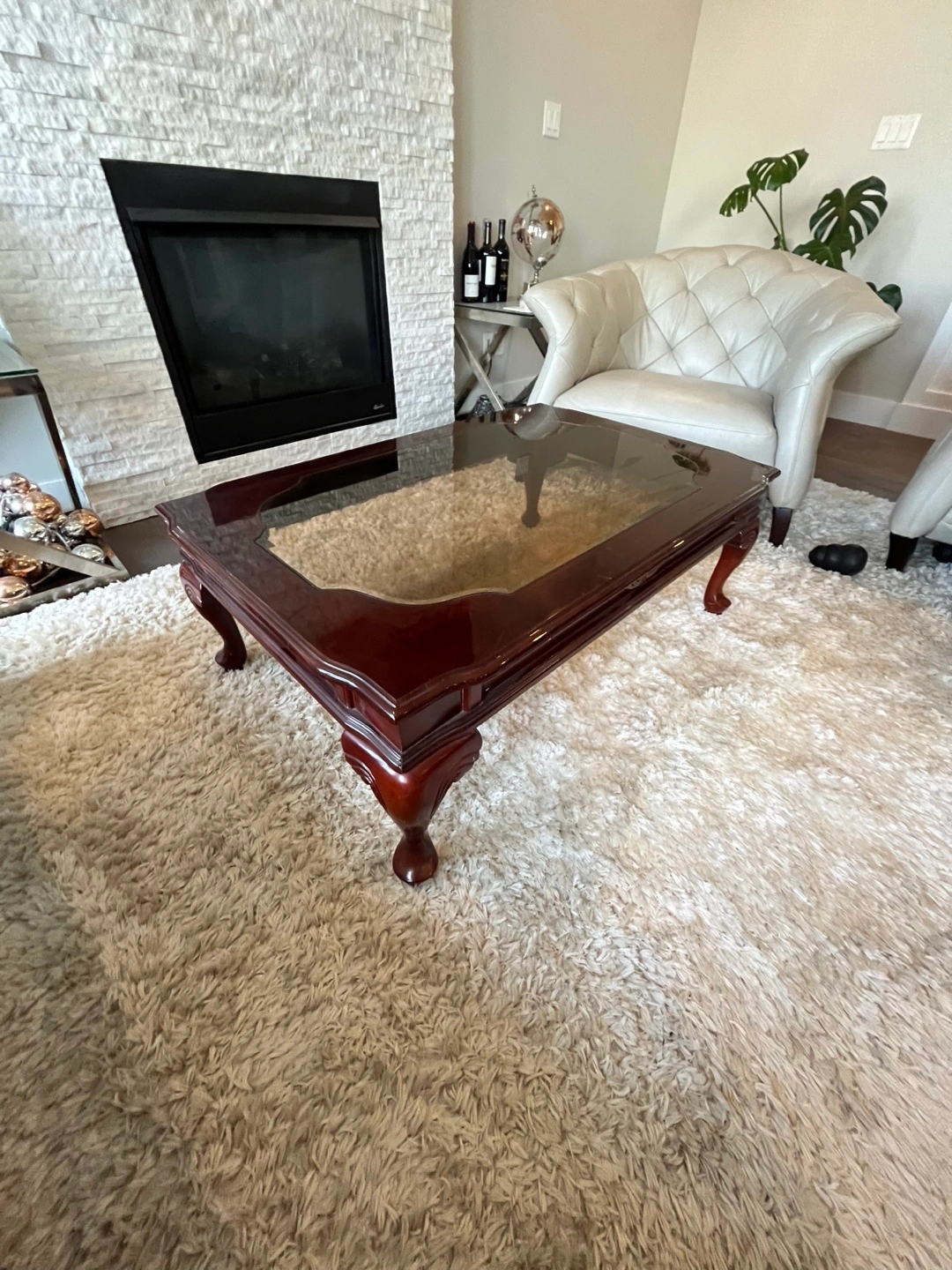 Selling a coffee table with a glass top. It features a dark wood frame with decorative carvings on the sides and legs. The table is in sturdy condition and would be a great addition to any living room. Some scratches on glossy wood surface.