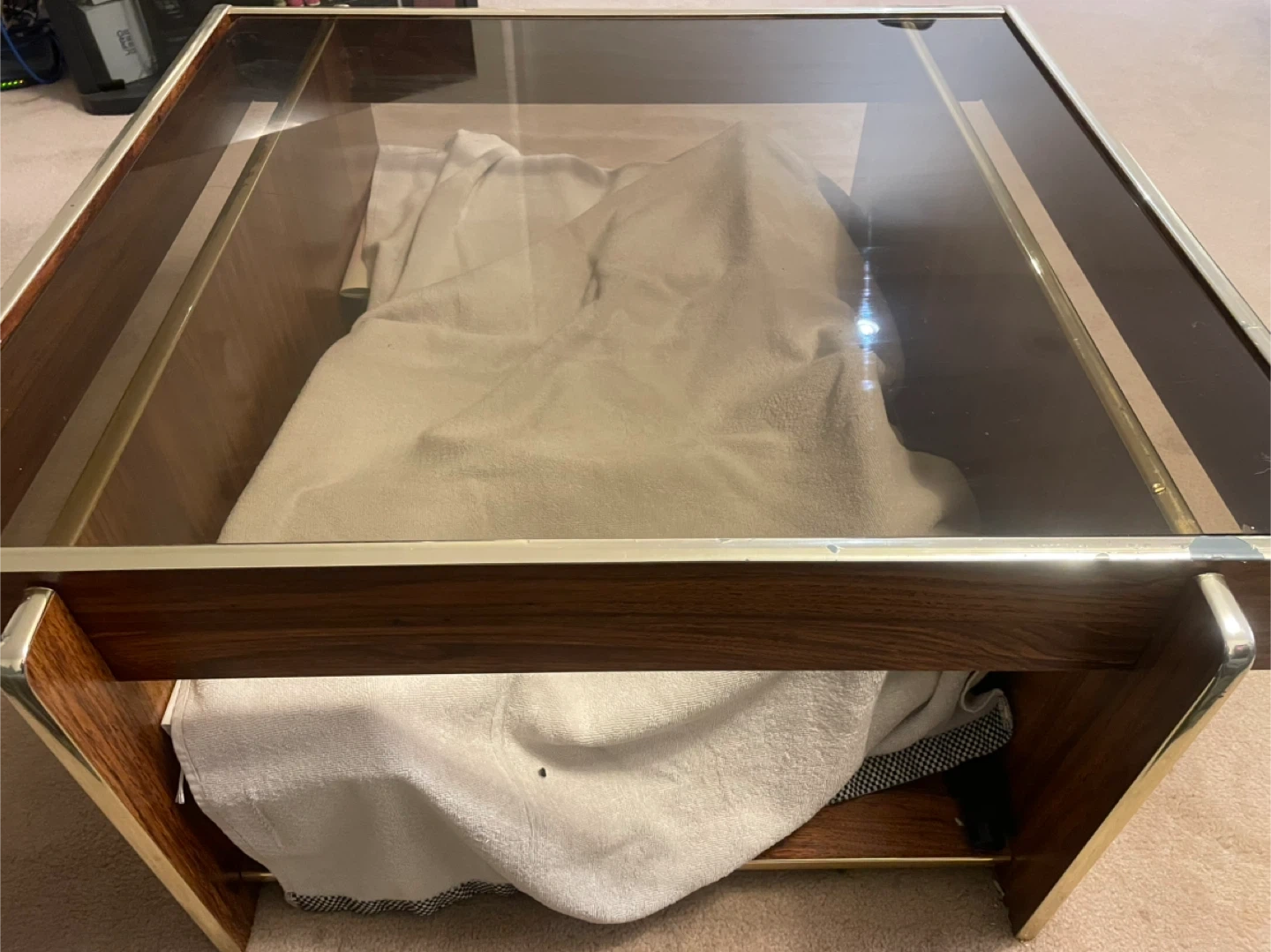 Selling a coffee table with a glass top. It has a wooden frame with gold accents. There is a shelf underneath the glass top for storage or display. Great for any living room!