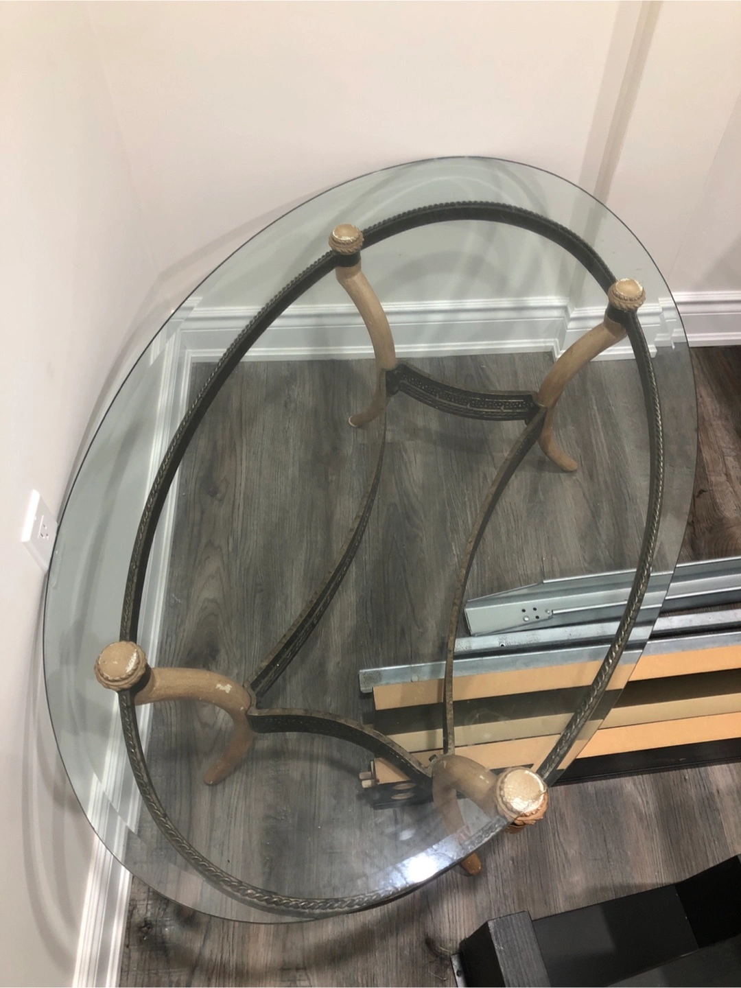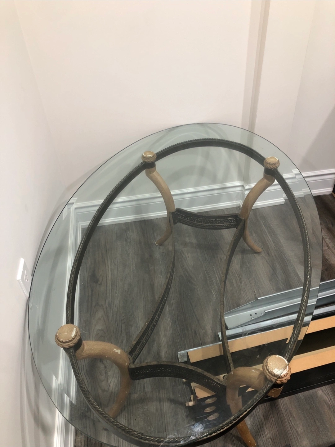 Selling a glass top coffee table. It's in great shape and would look lovely in any living room. The metal frame has a unique design. Perfect for adding a touch of elegance to your home!