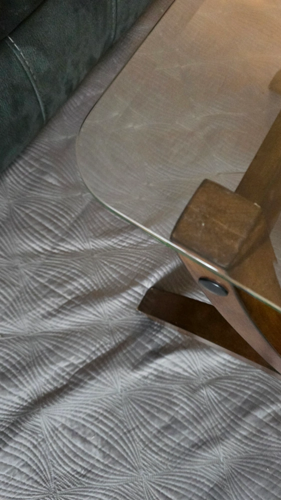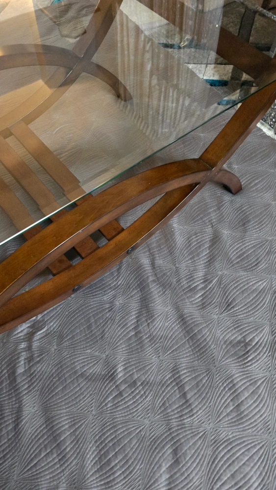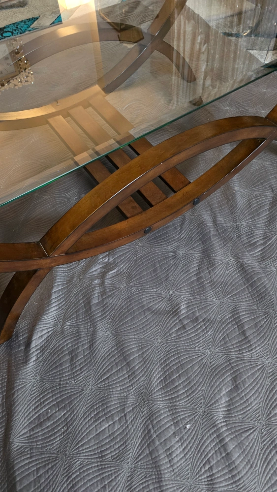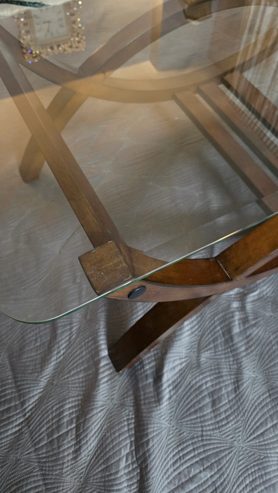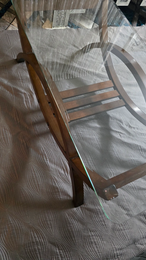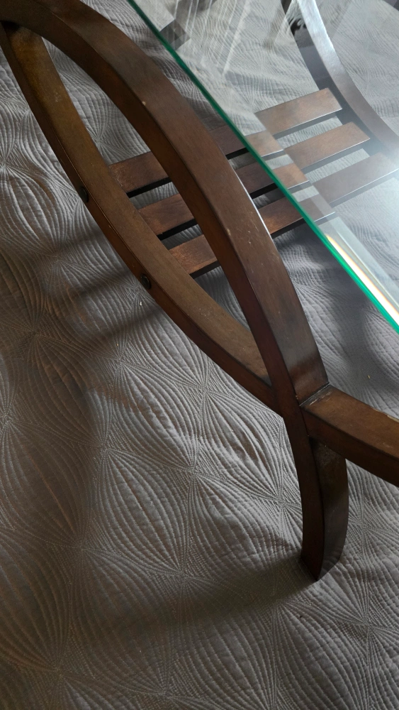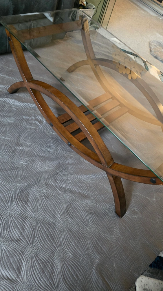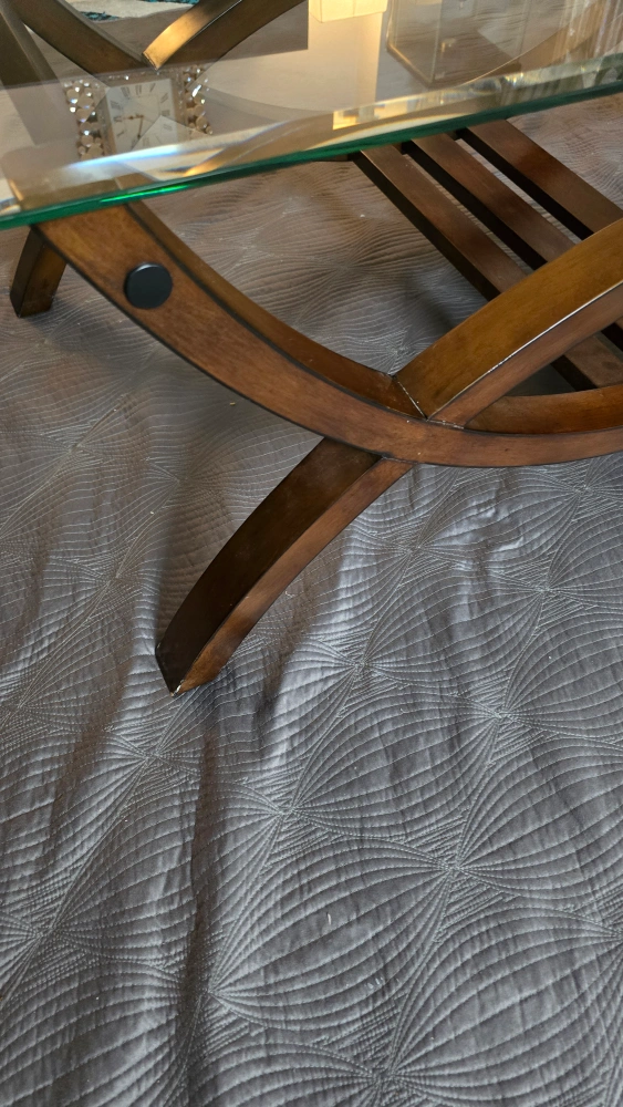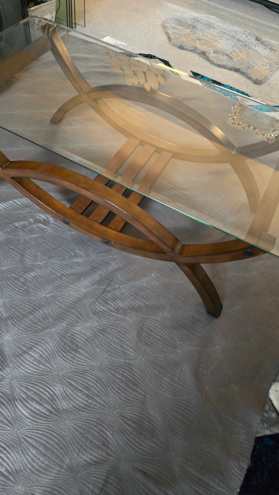 Selling a unique glass top coffee table with a wooden frame. The design is quite eye-catching with its curved legs and oval accents. It's in great condition and would be a lovely addition to any living room