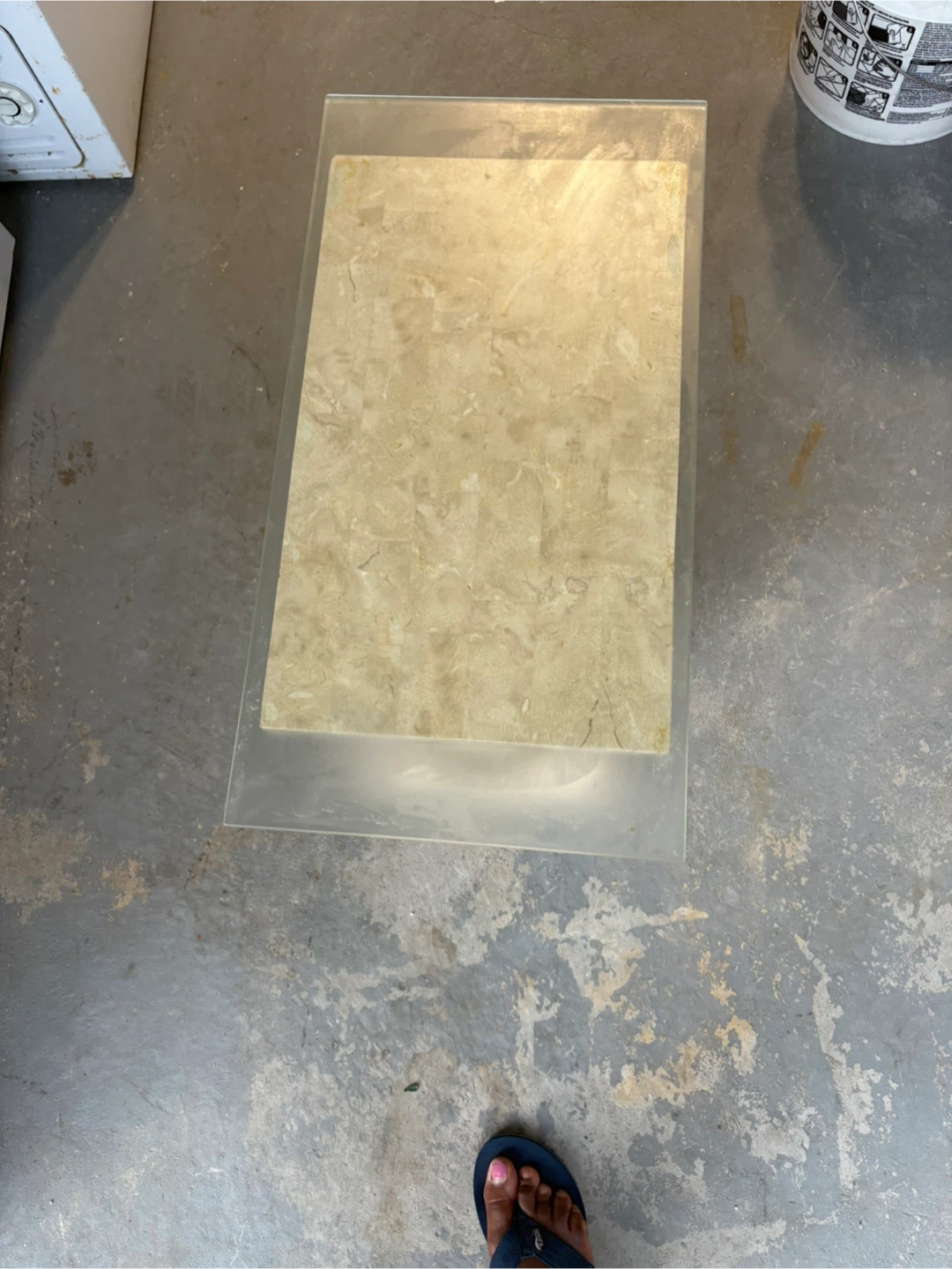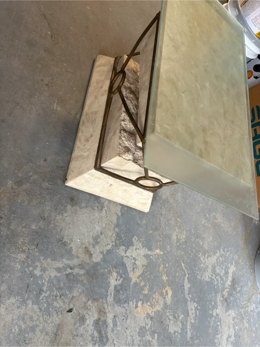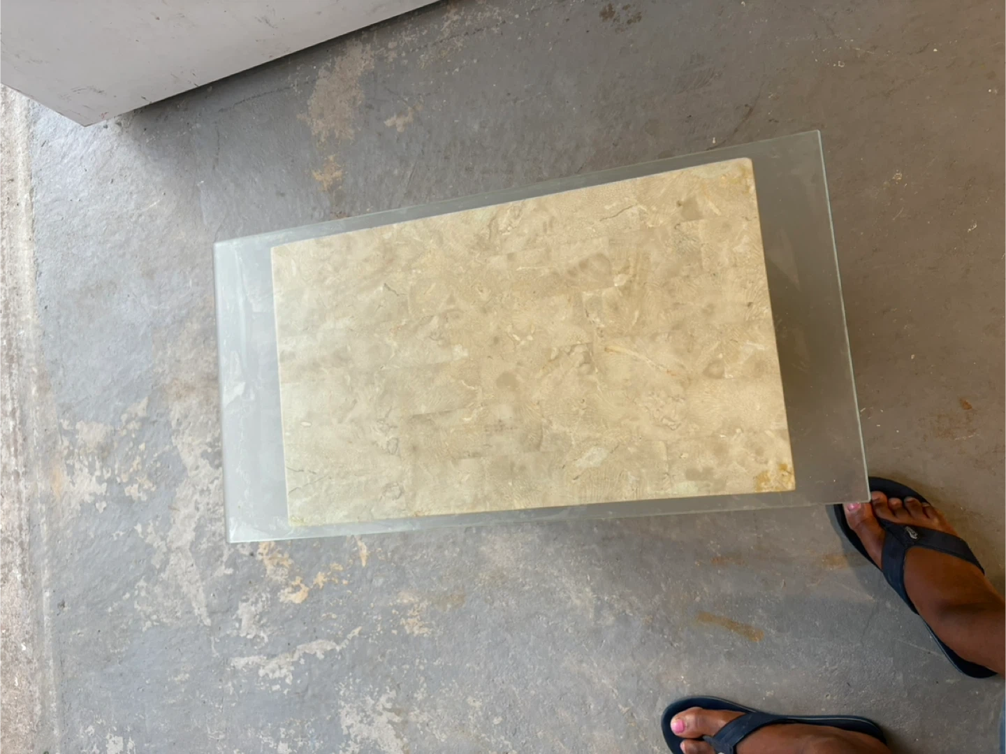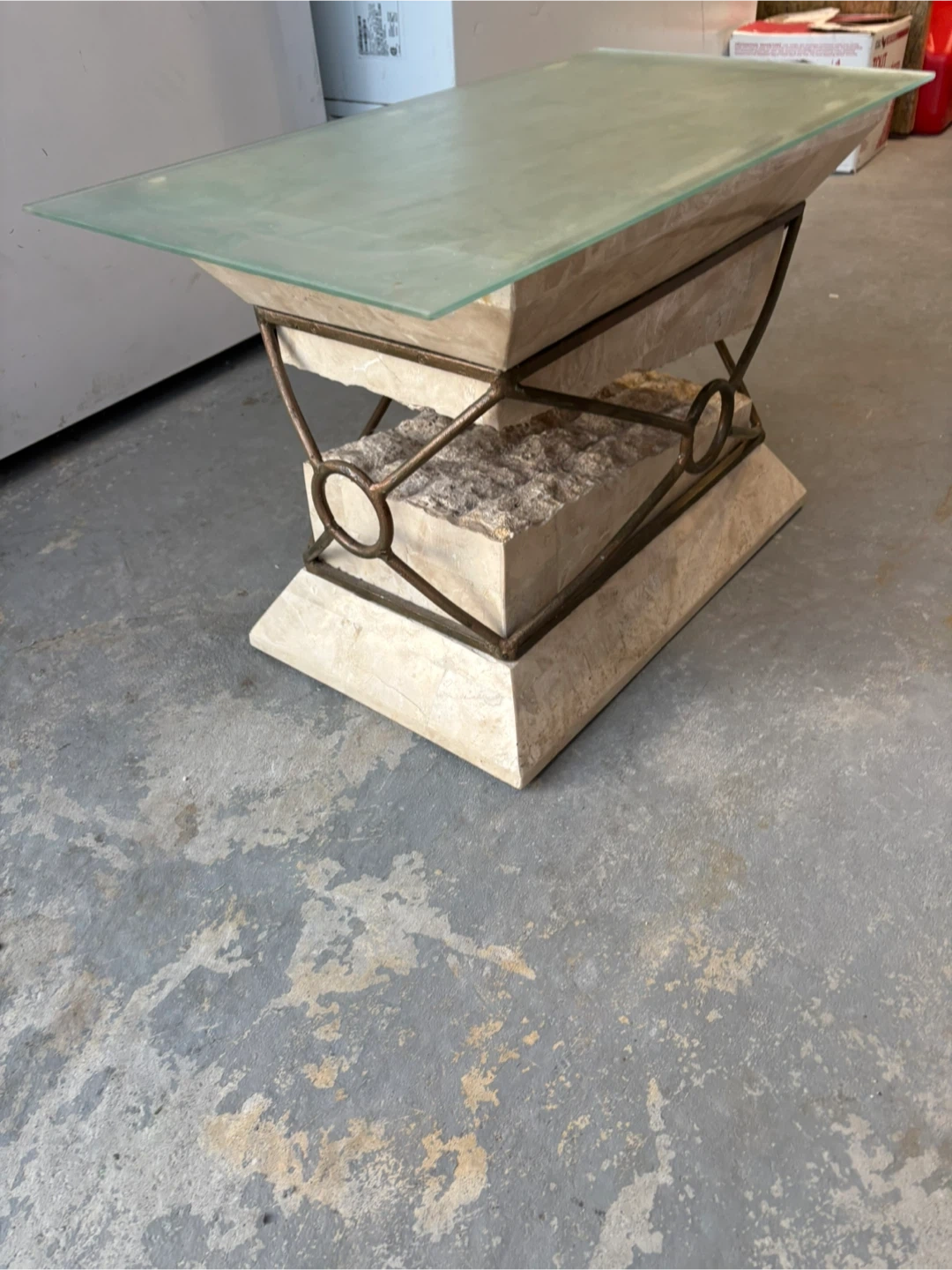 Selling a unique coffee table featuring a glass top and a decorative stone base. It's a real statement piece! The base has an interesting metal frame. It's in good condition and ready to add some character to your living room