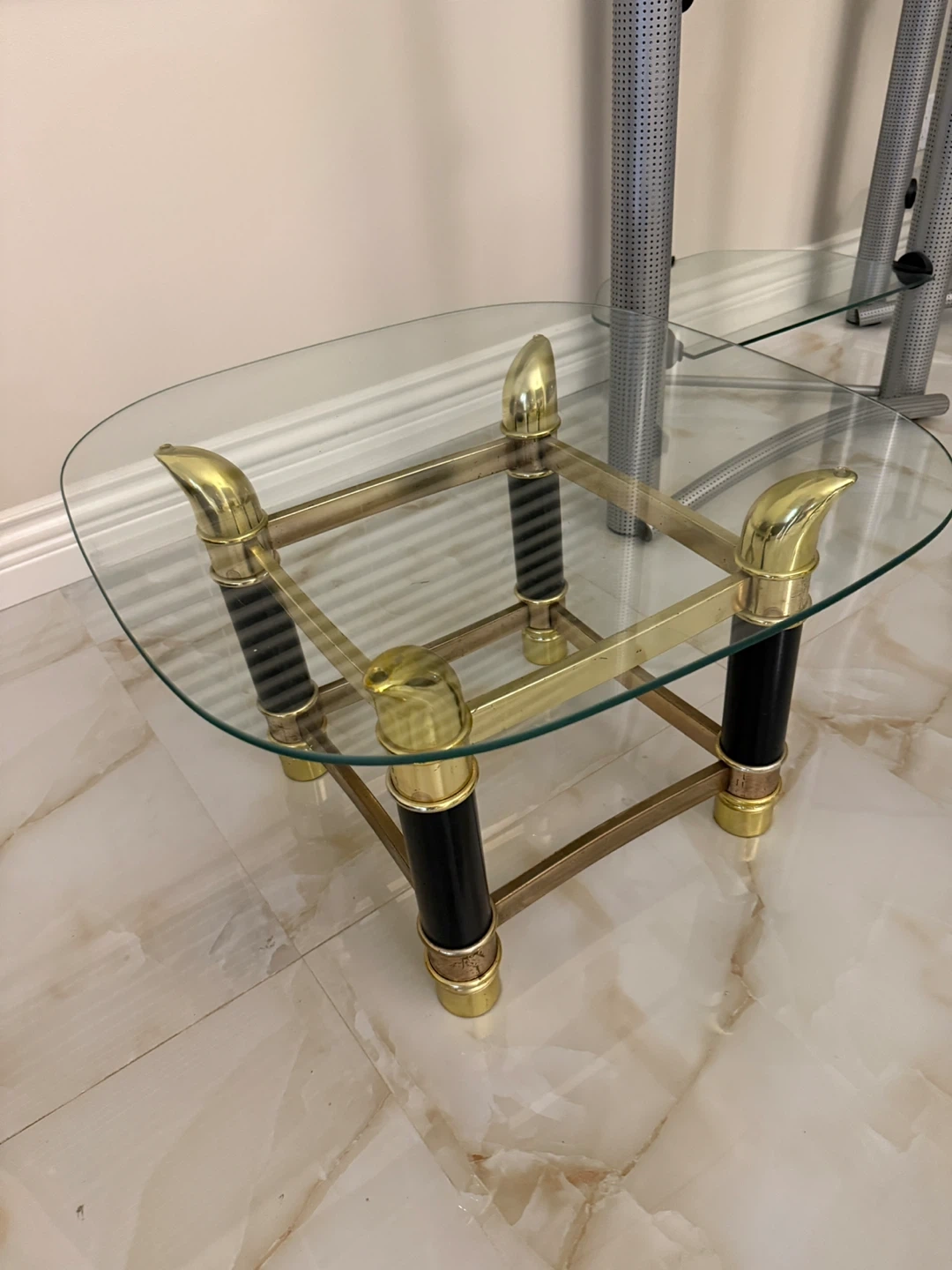 Selling a stylish glass-top coffee table. It features a unique design with brass and black accents. The table is in good condition and would make a great addition to any living room or seating area. The glass is clear and the frame is sturdy.