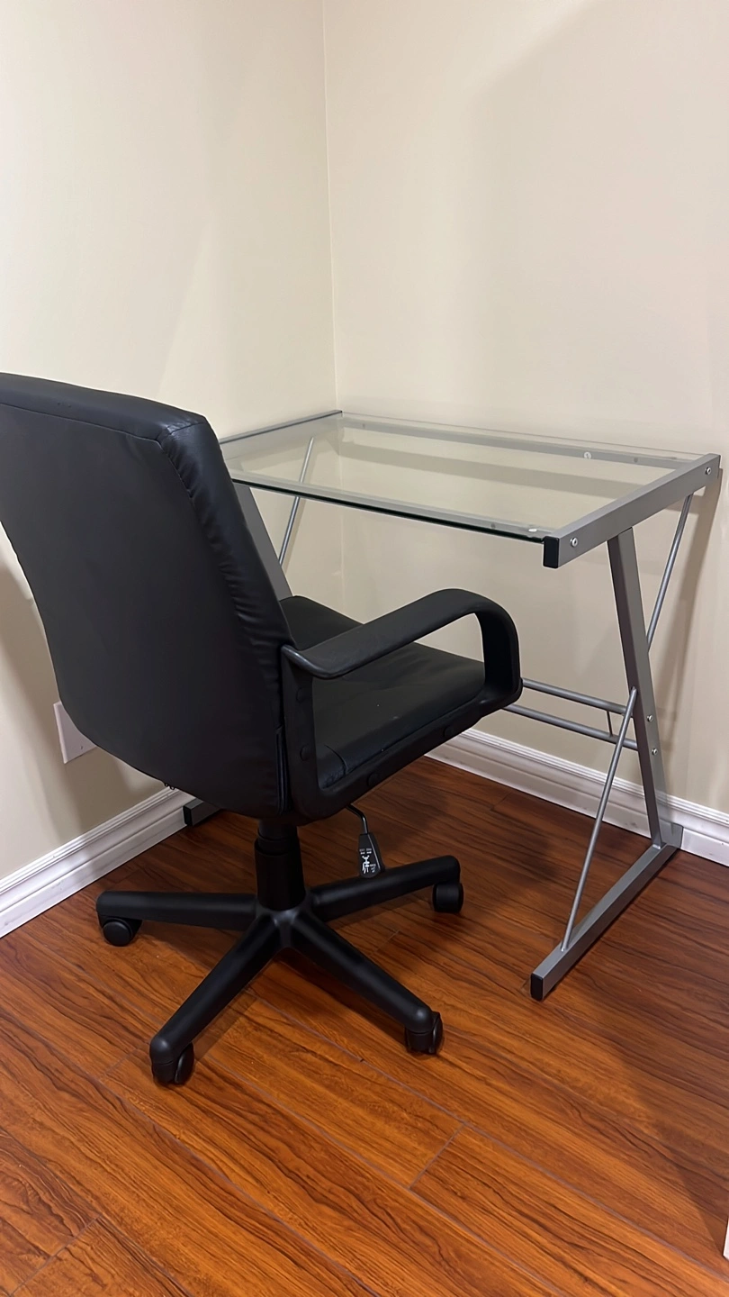 Selling a glass top desk paired with a comfy black office chair! The desk has a sleek, modern look with its glass surface and silver frame. The office chair is in great shape and provides good support for those long work sessions. Perfect for a home office or study space!