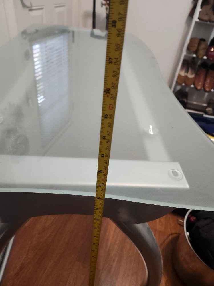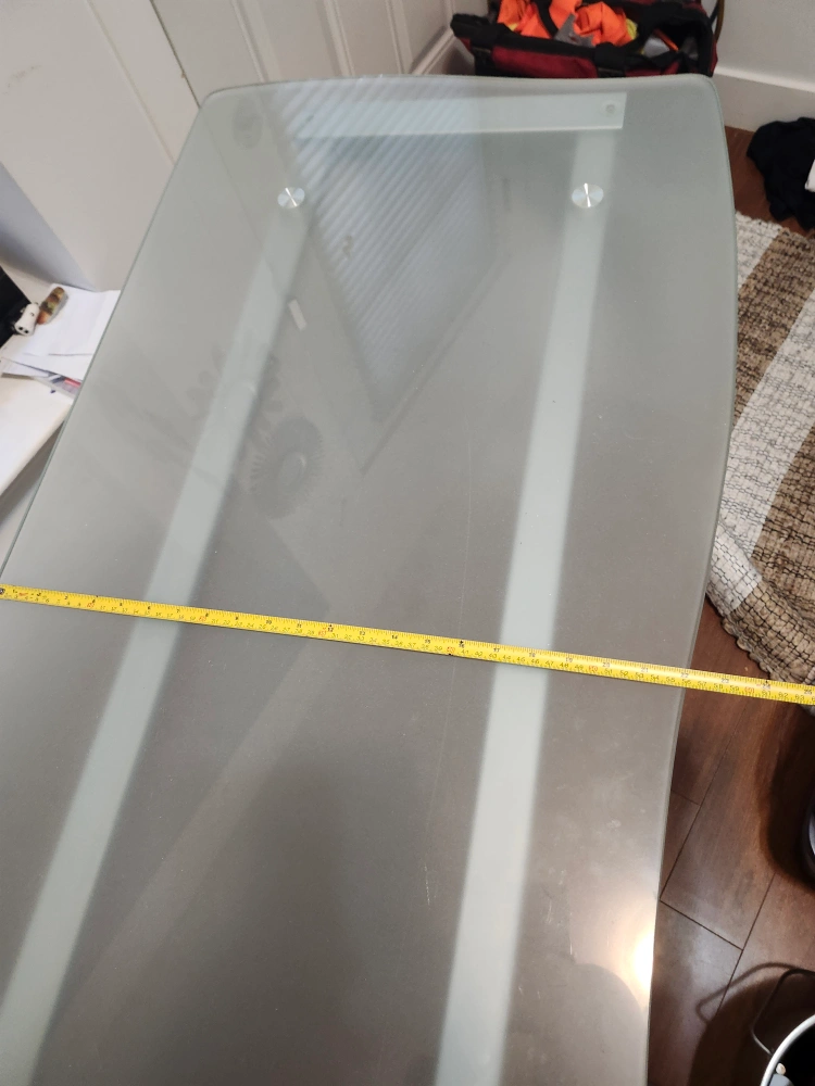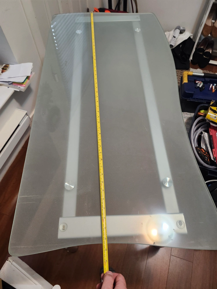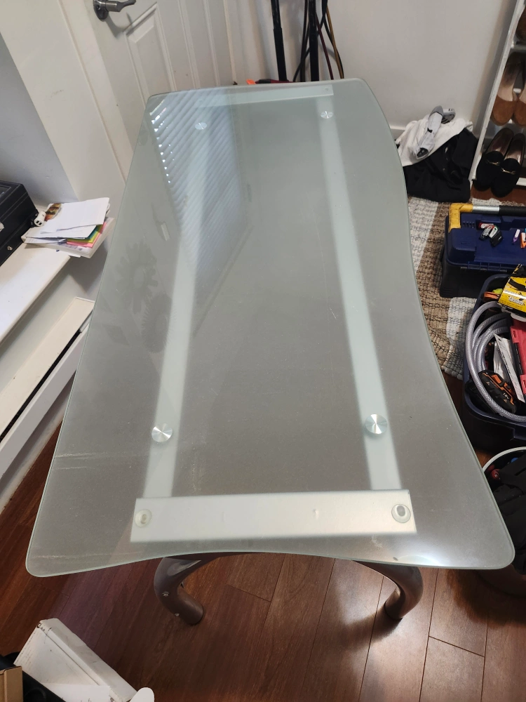 Selling a glass top office table. It measures approximately 45 inches in length and 22 inches in width. height 30in (can deliver +delivery fee)