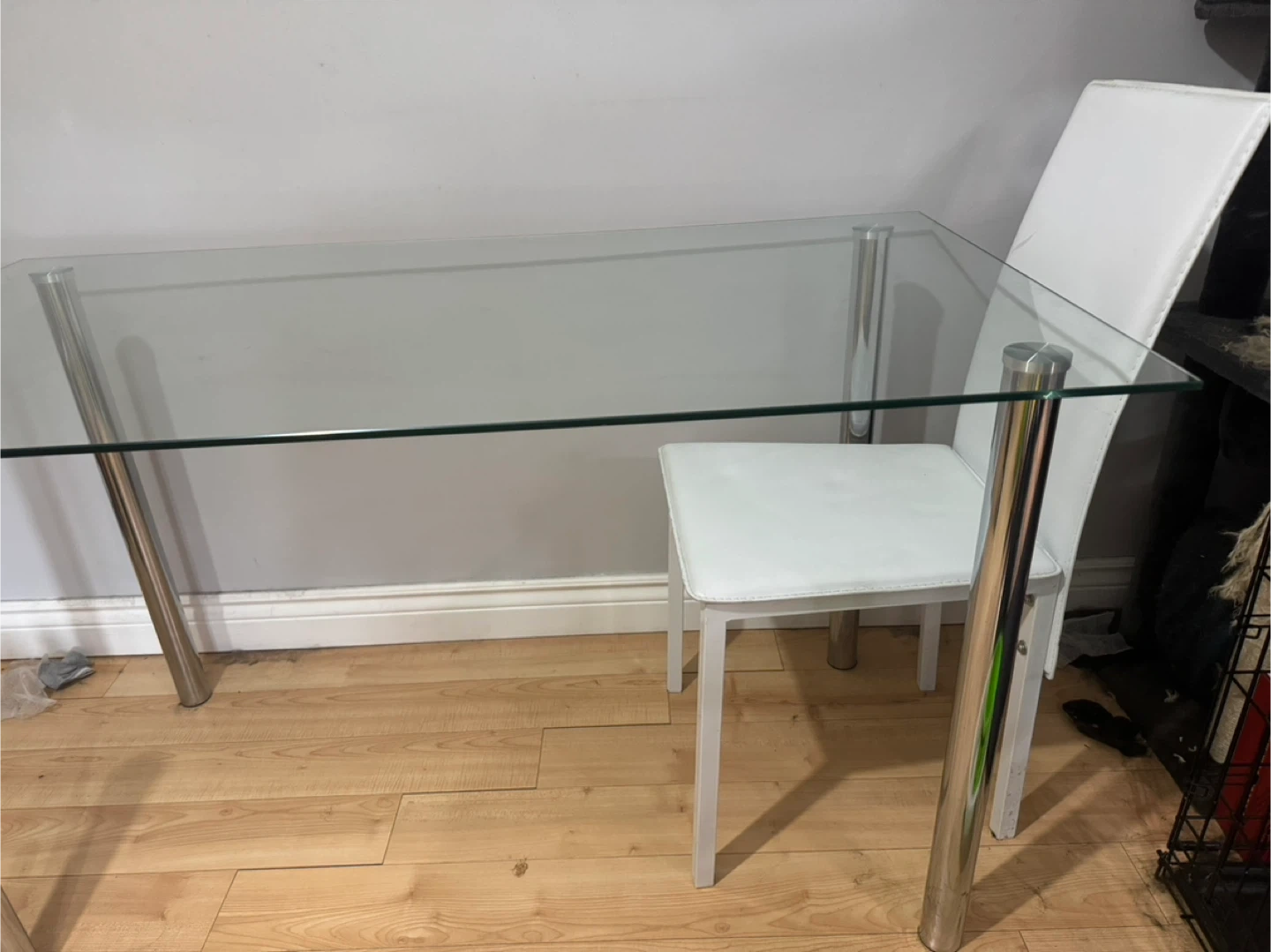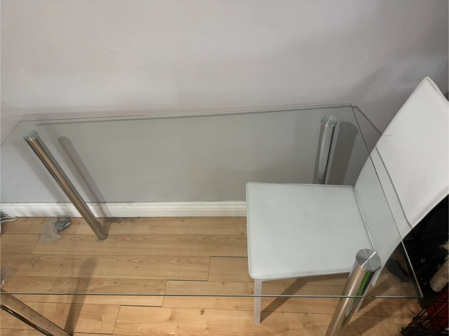 Selling a glass top dining table. The table features a clear glass surface and chrome legs. It's a simple and stylish table for a small dining space or kitchen nook. Table top is 54x28 inches 4 white chairs also for sale