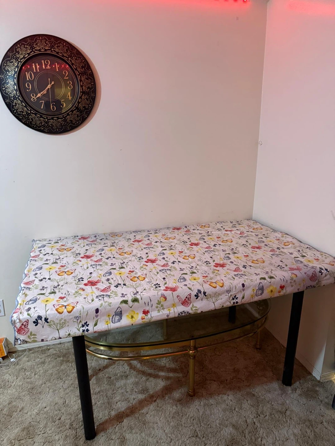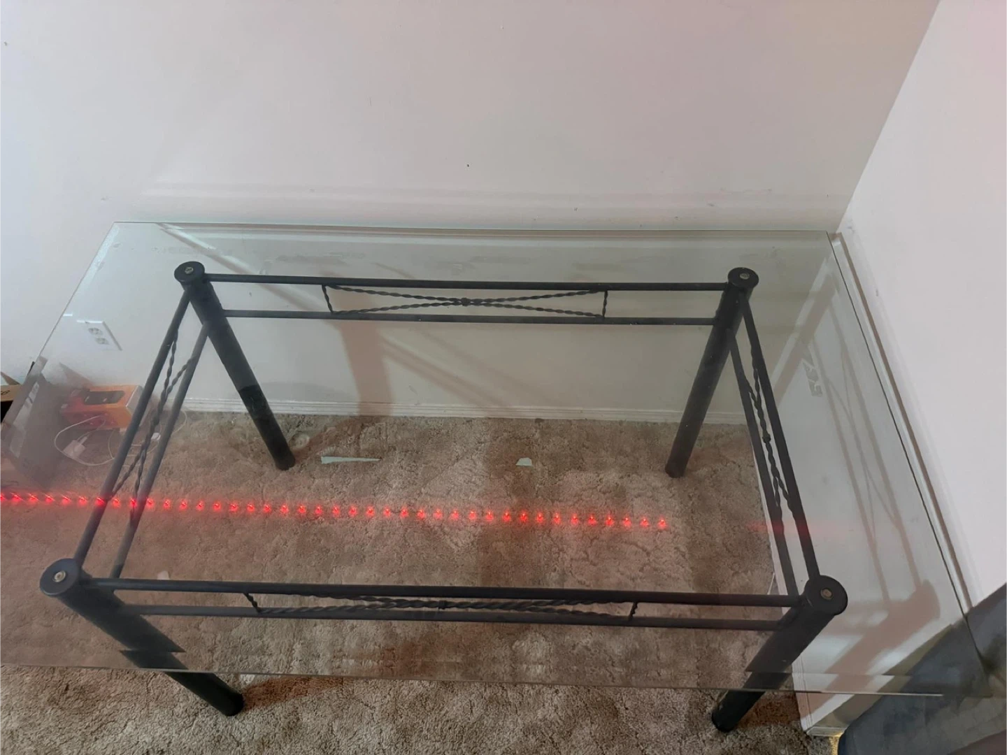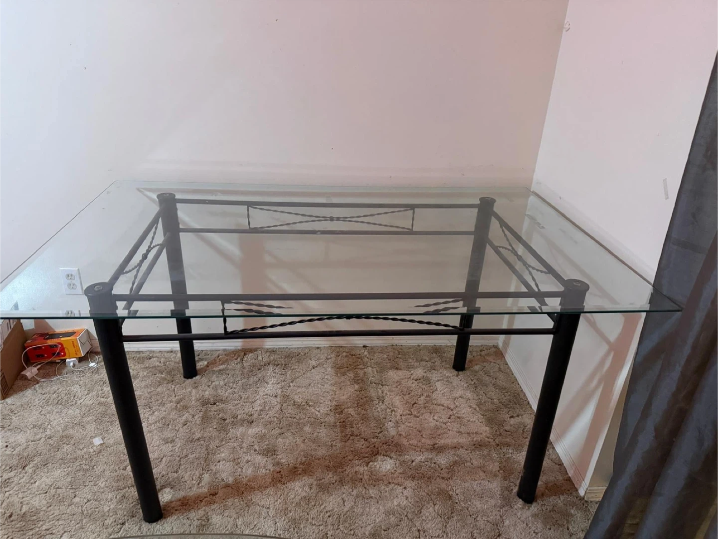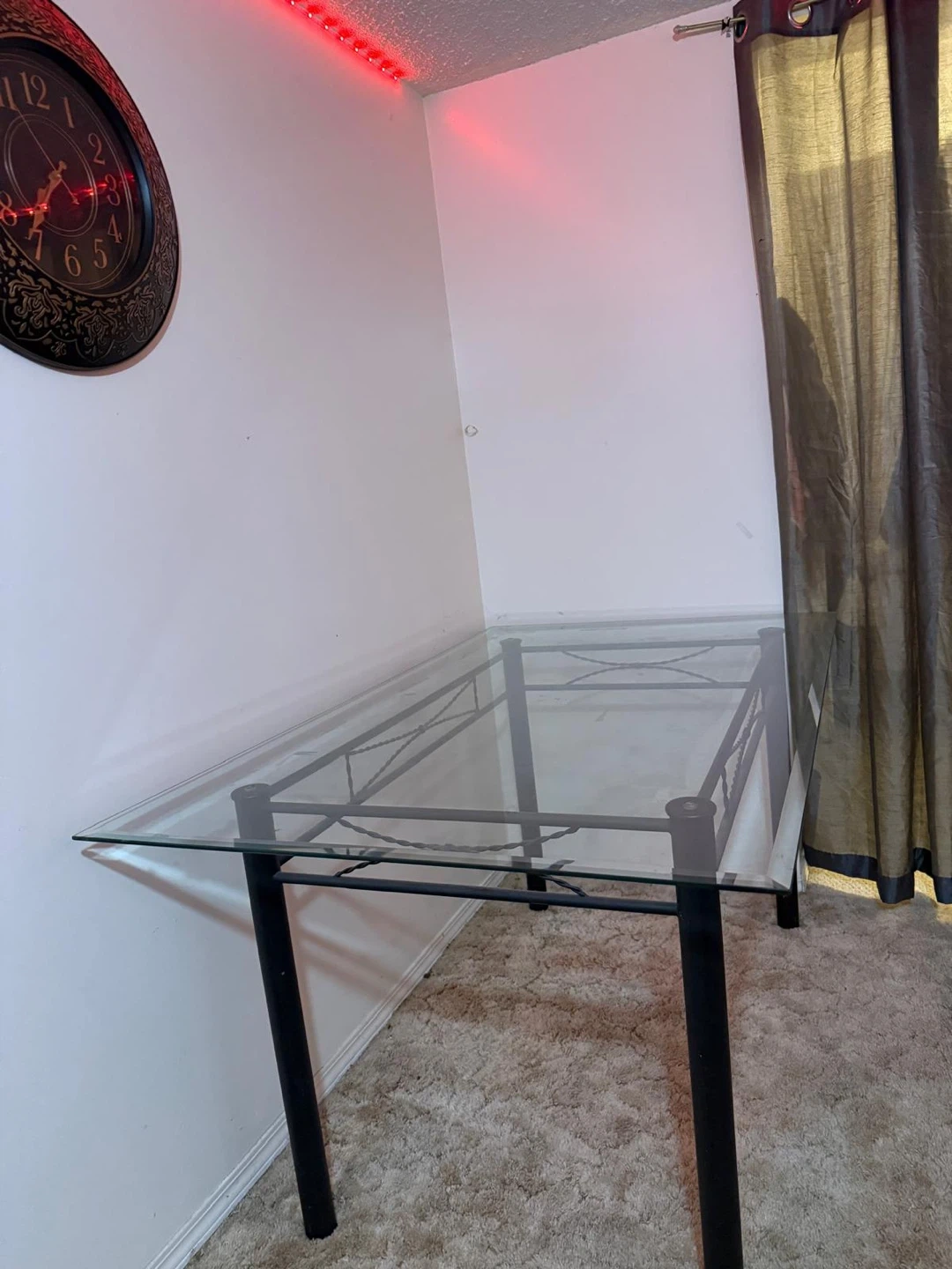 Selling a glass top dining table. It has a metal frame with black legs. The glass top is in good condition and the table is sturdy. Perfect for a small dining area or kitchen! Dimensions: 59”x36” Note: No chairs, only table