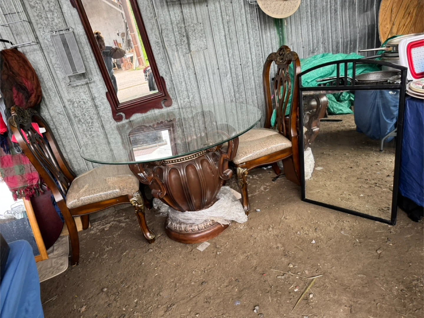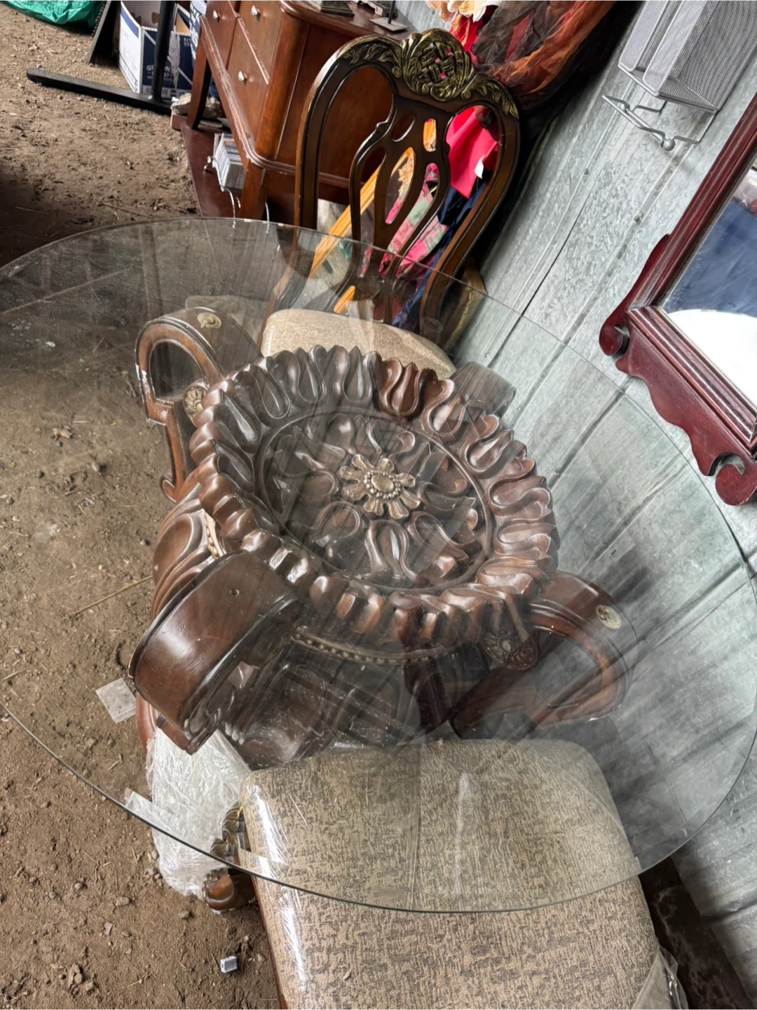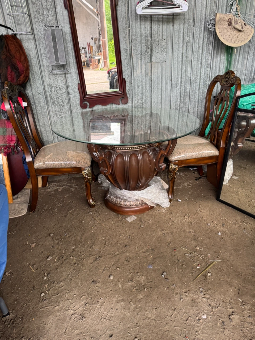 Selling a beautiful glass top dining table with two matching chairs. The table features a unique, ornate base and the chairs have a lovely detailed design. Perfect for adding a touch of elegance to your dining space!