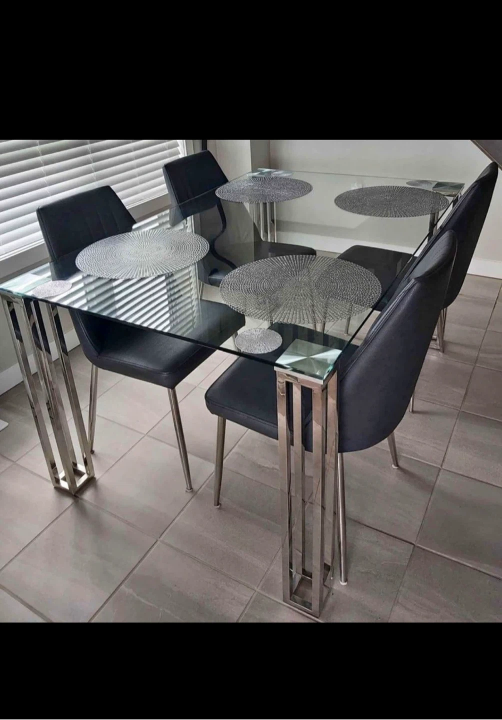 Selling a modern dining table set! It features a sleek glass top and comes with four comfortable black chairs. The table legs and chair frames are a stylish silver colour. Perfect for a dining room or kitchen space!