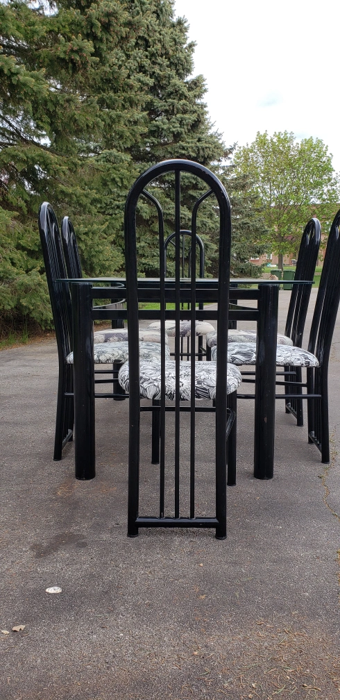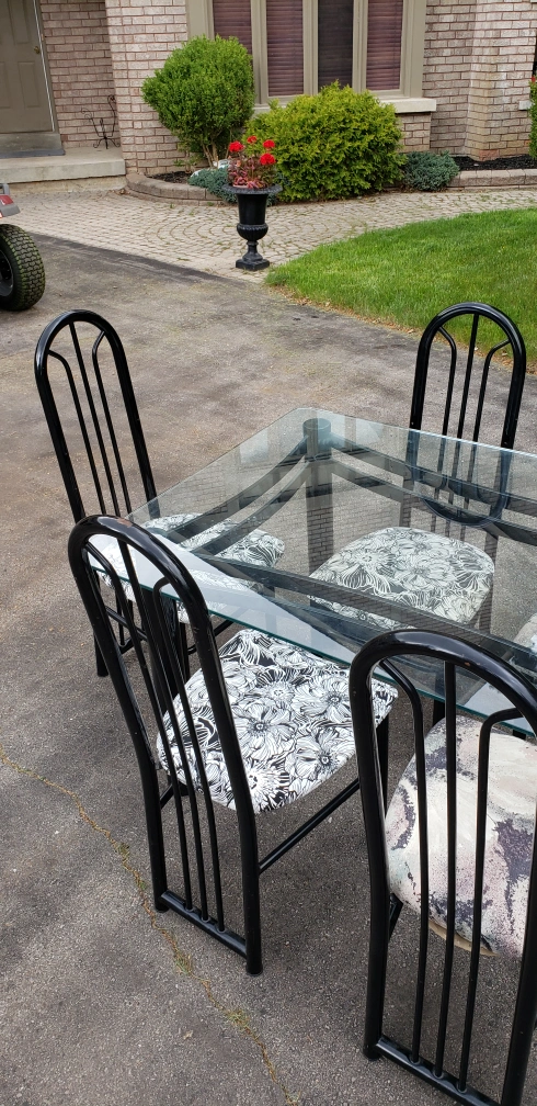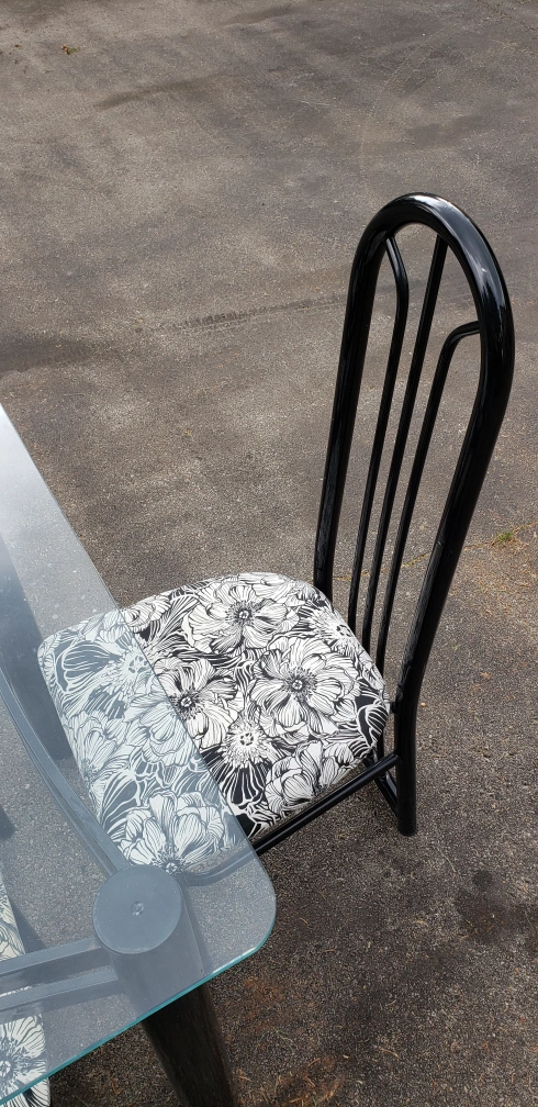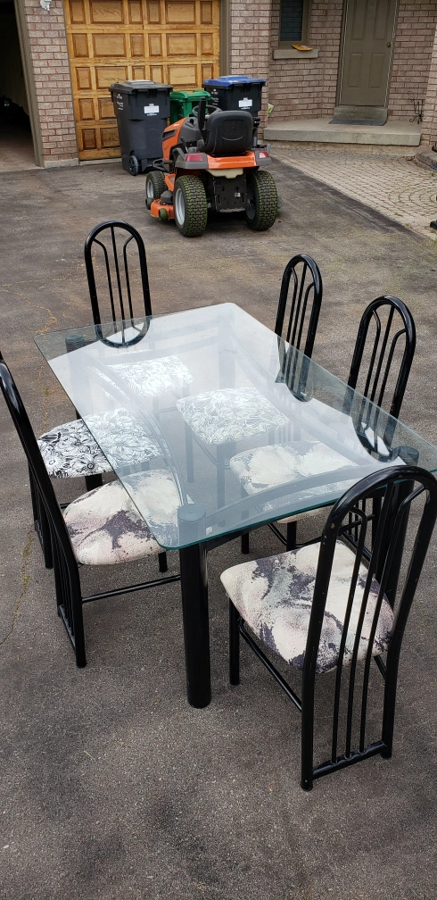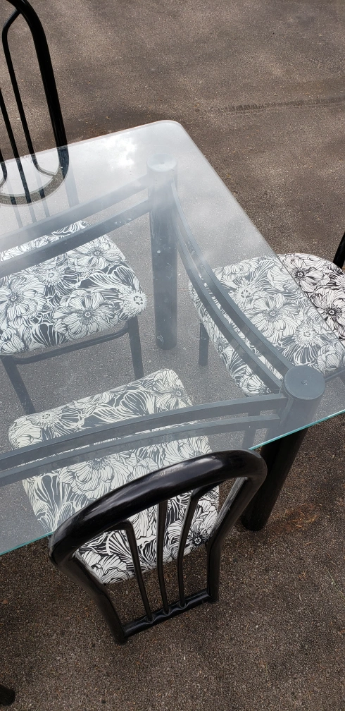 Selling a dining table set that includes a glass top table and six matching chairs. The chairs have a black metal frame and a padded seat with a floral pattern. The table has a black metal frame as well.
