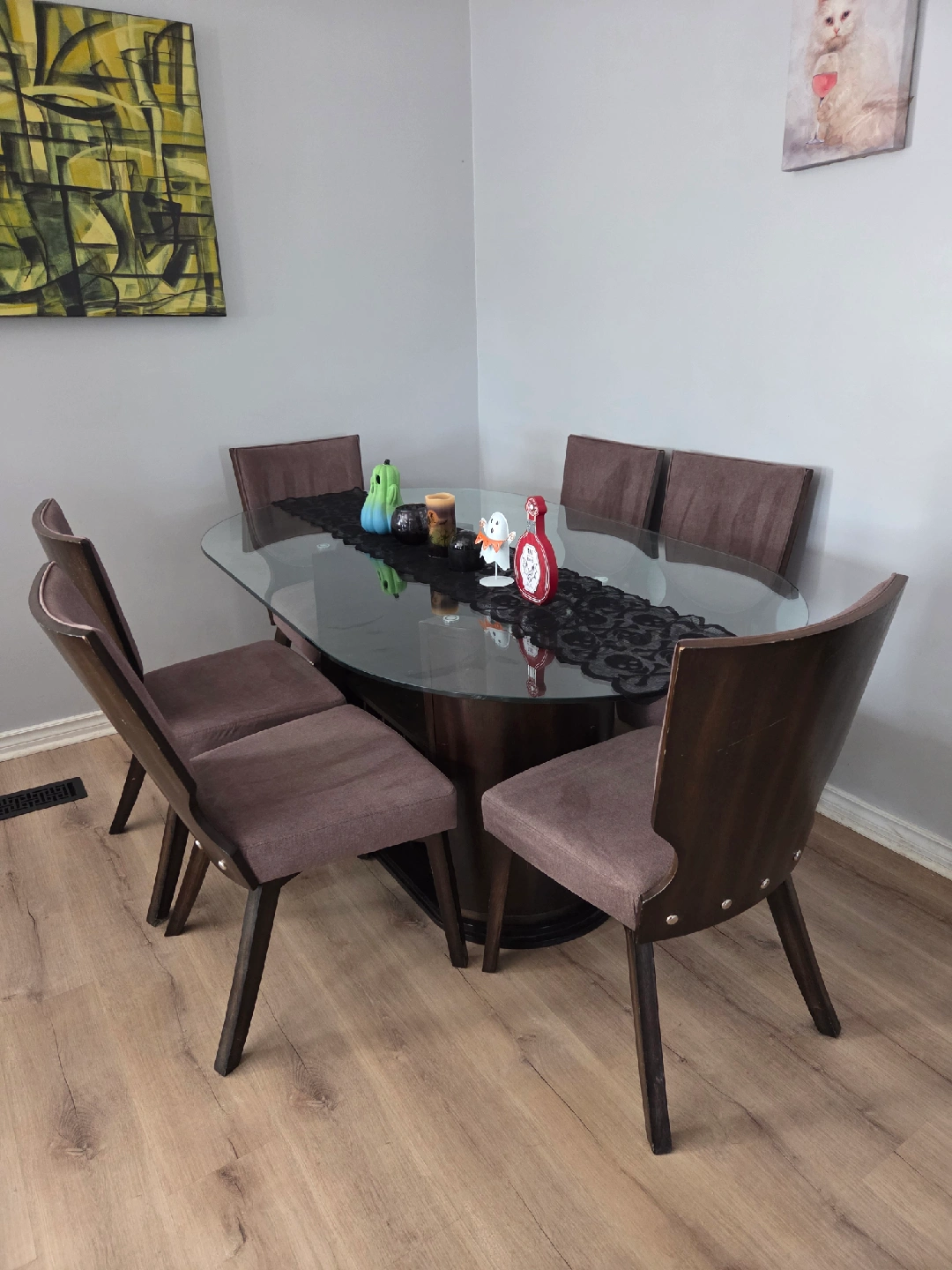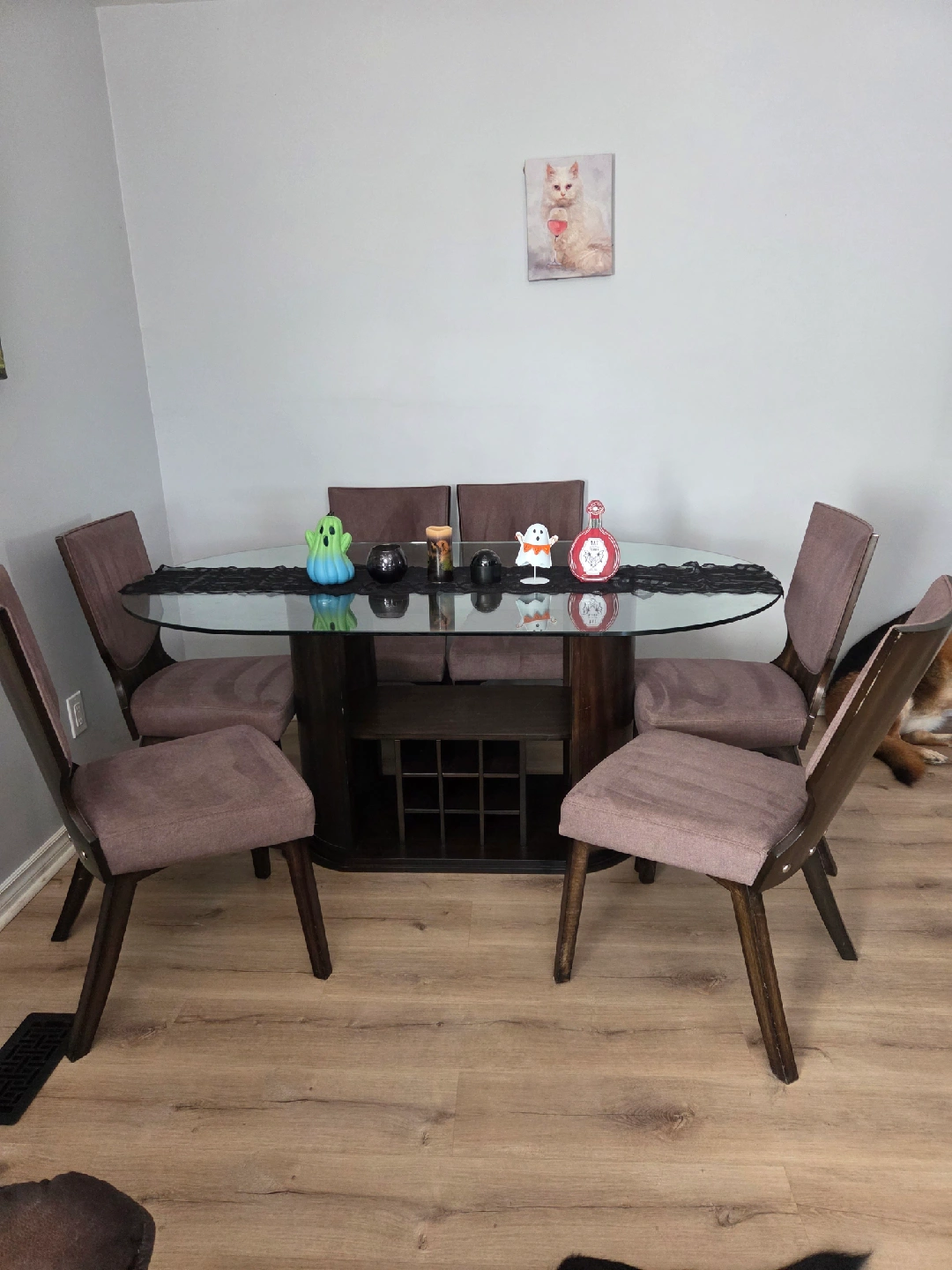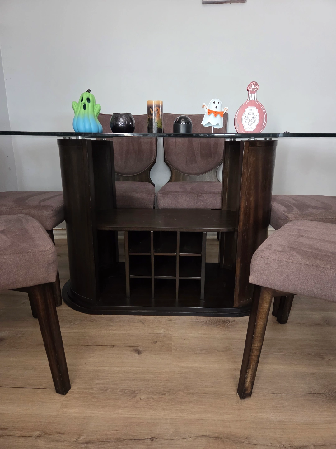 Selling a dining table with a glass top and six chairs. The chairs have a brown fabric seat and a dark wood frame. It's a stylish set that would look great in any dining room! *can hold 6 wine bottles + spacious sides to hold more, or anything of your choosing *1 chair just needs to be tightened as its become a little loose. *Animal friendly home so cats have been on the seats *will need a deep cleaning if not being refurbished *has nicks and scratches from wear and tear over time