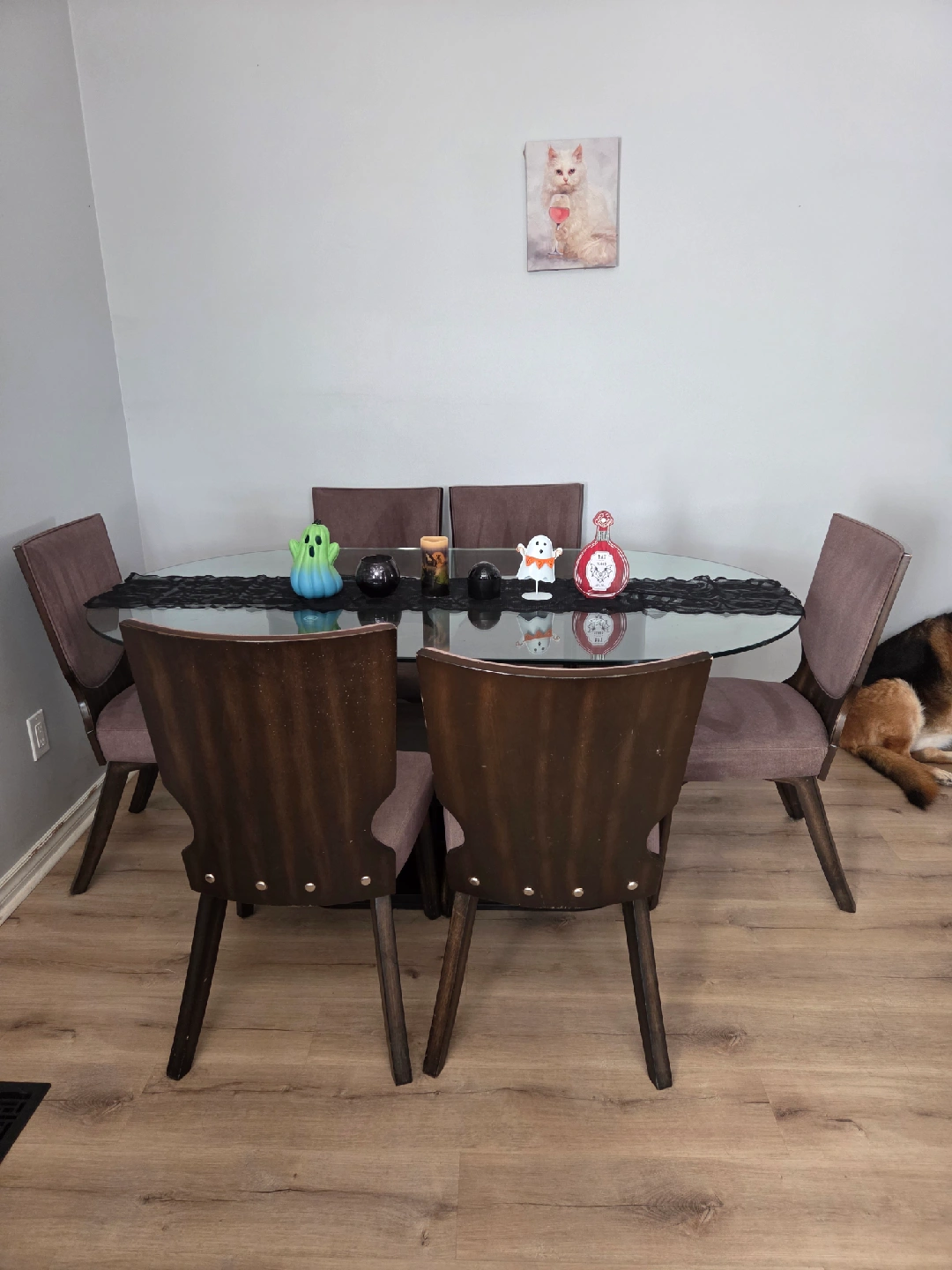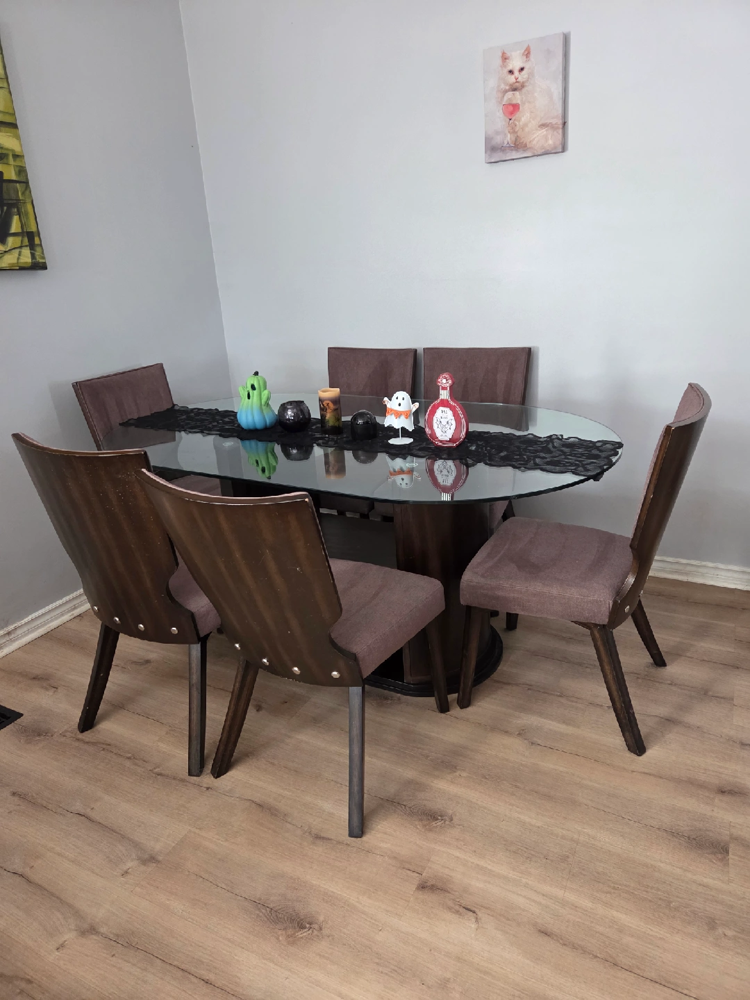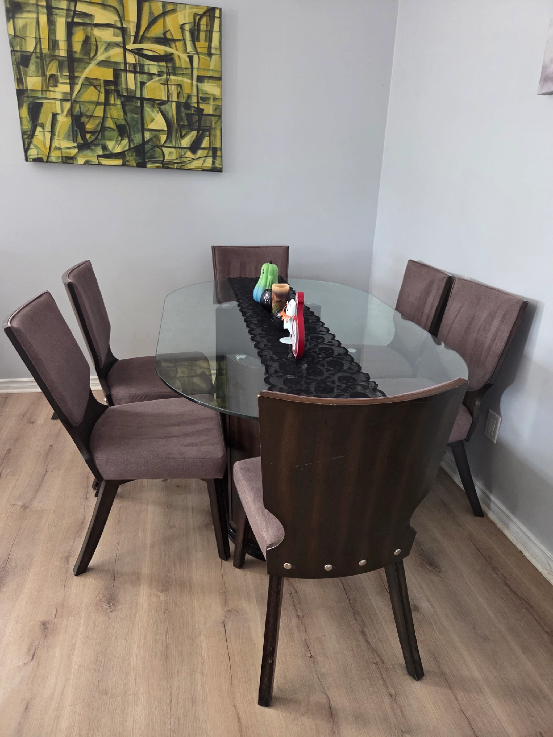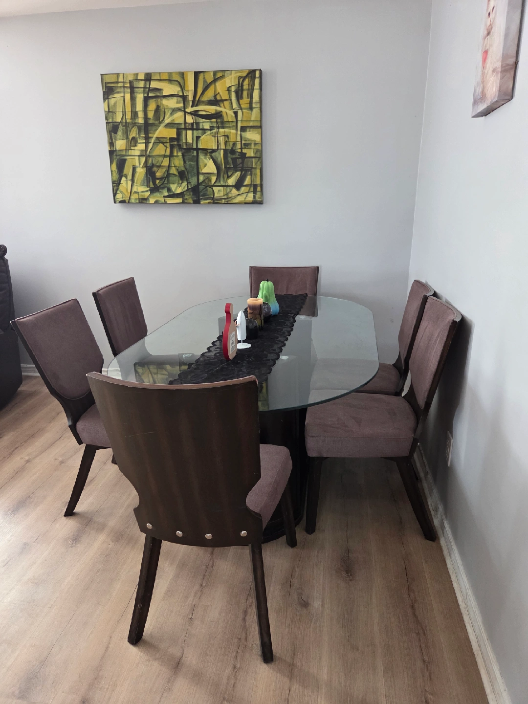 Selling a dining table with a glass top and six chairs. The chairs have a brown fabric seat and a dark wood frame. It's a stylish set that would look great in any dining room! *can hold 6 wine bottles + spacious sides to hold more, or anything of your choosing *1 chair just needs to be tightened as its become a little loose. *Animal friendly home so cats have been on the seats *will need a deep cleaning if not being refurbished *has nicks and scratches from wear and tear over time