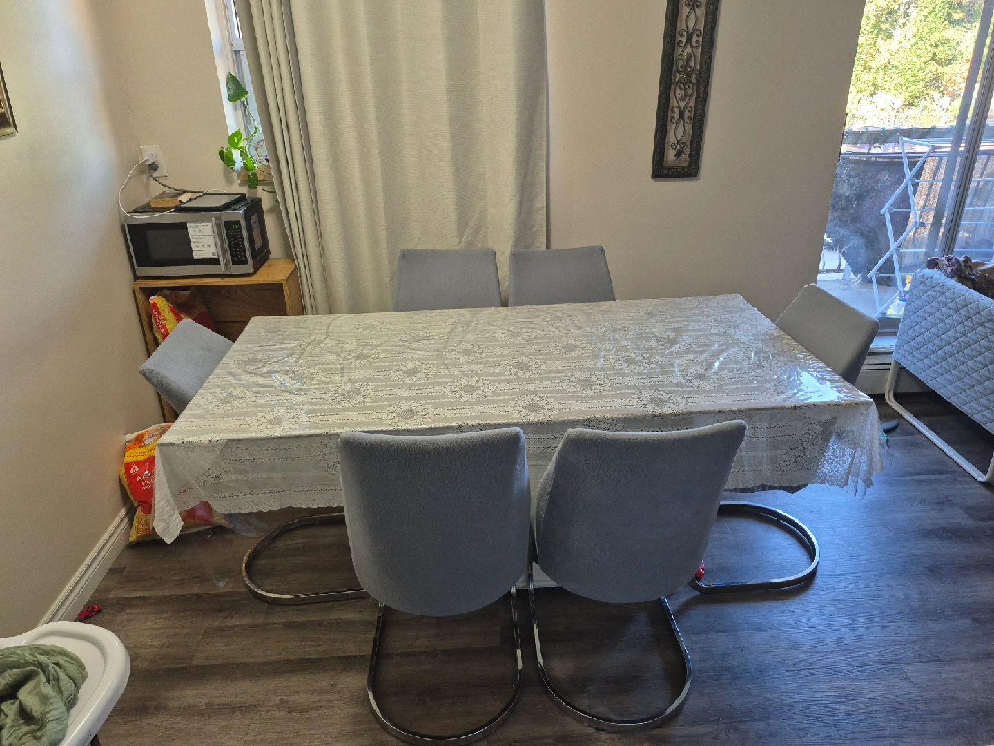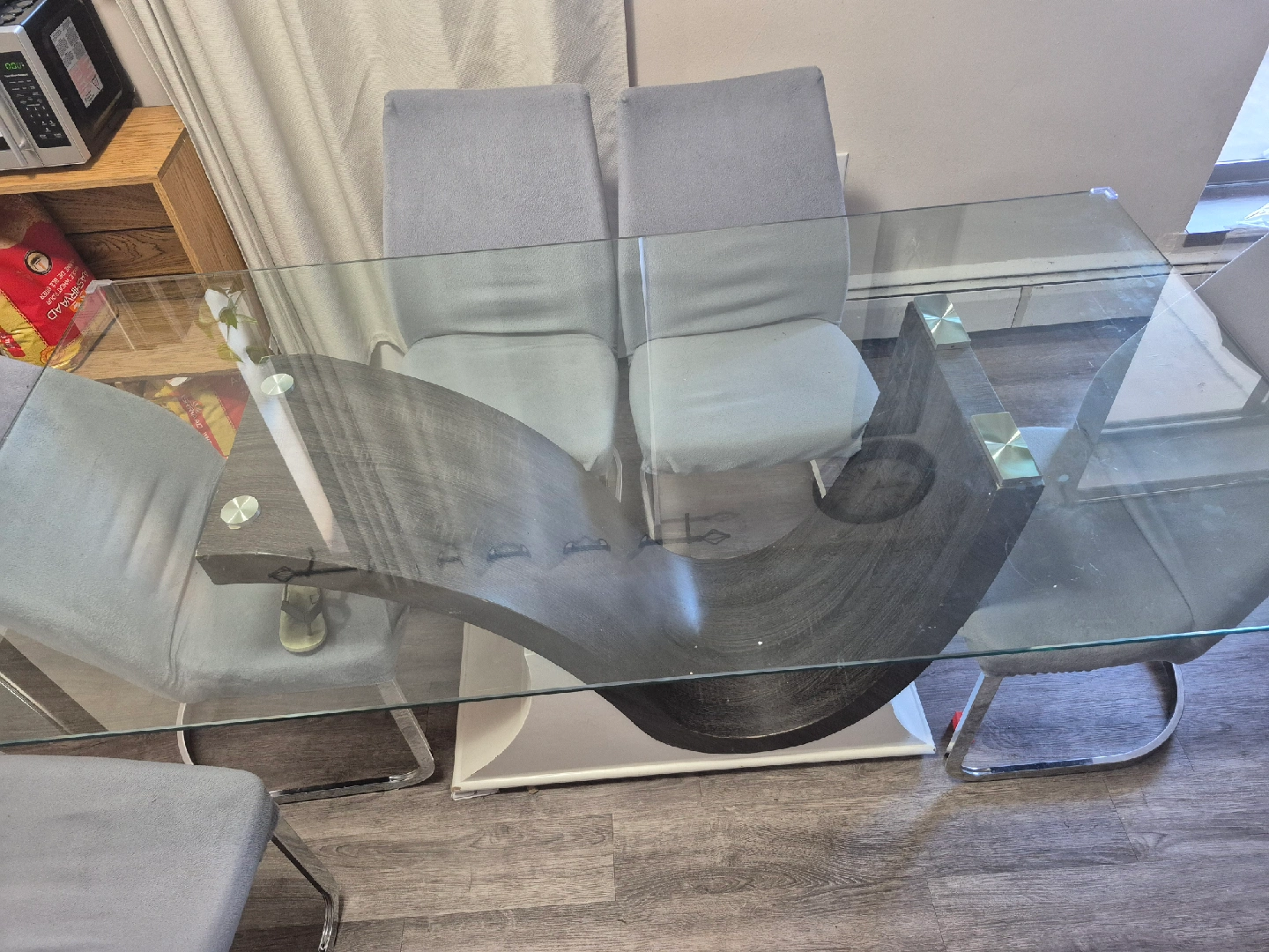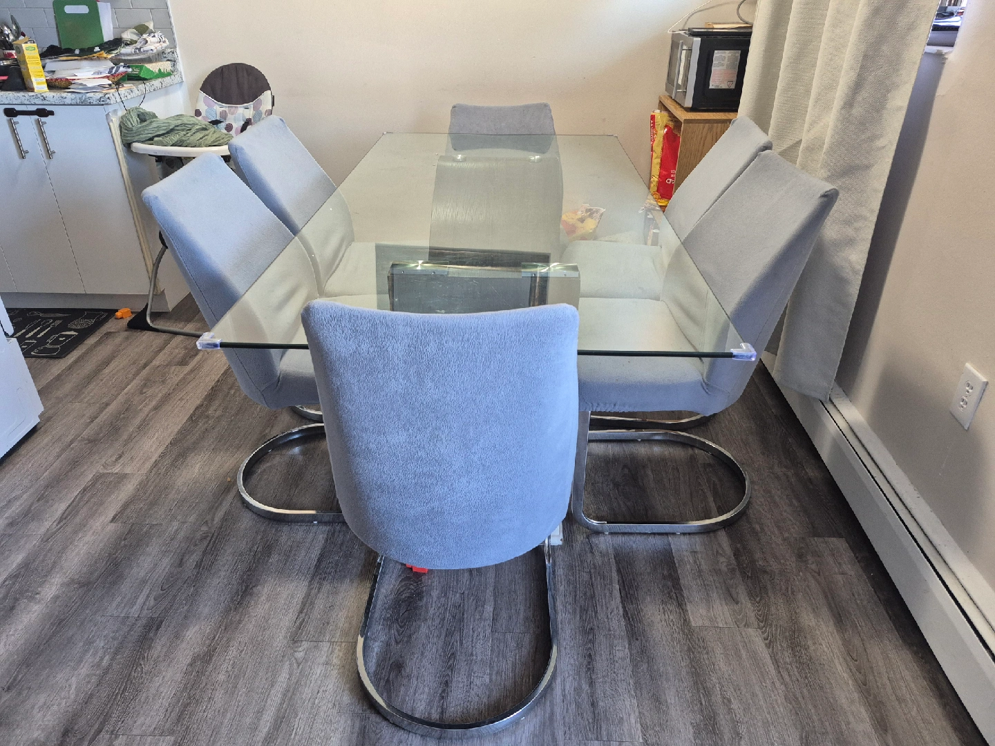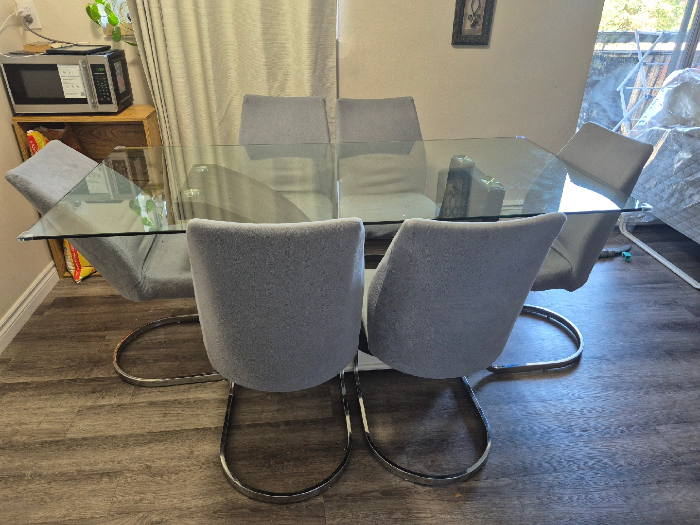 Selling a modern dining table with a glass top and six matching chairs. The chairs are upholstered in a light grey fabric and have a sleek, chrome base. Perfect for a dining room or kitchen space! The set is in great condition and ready for a new home